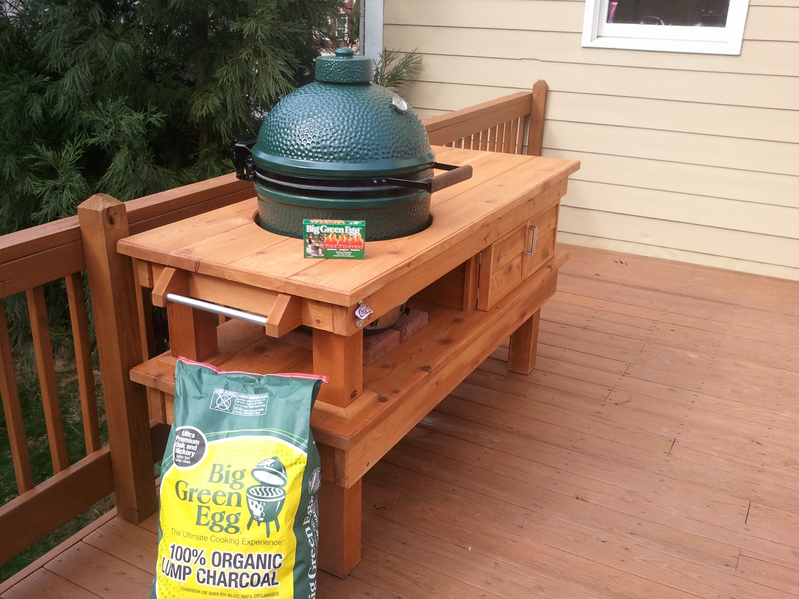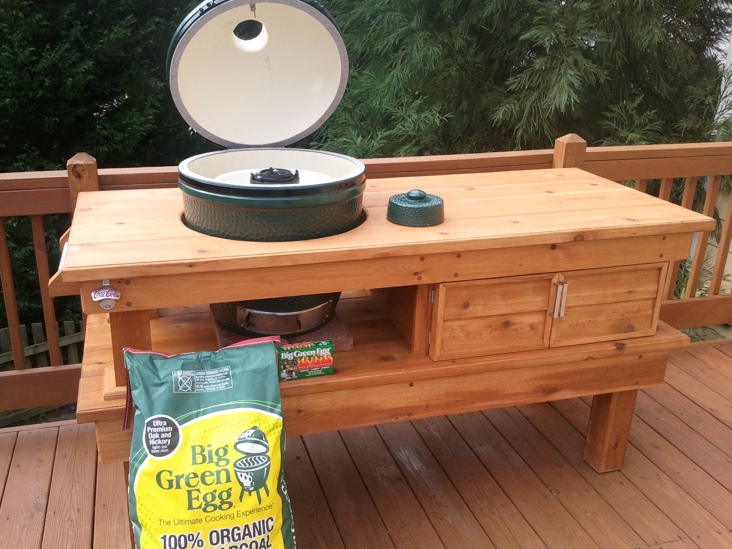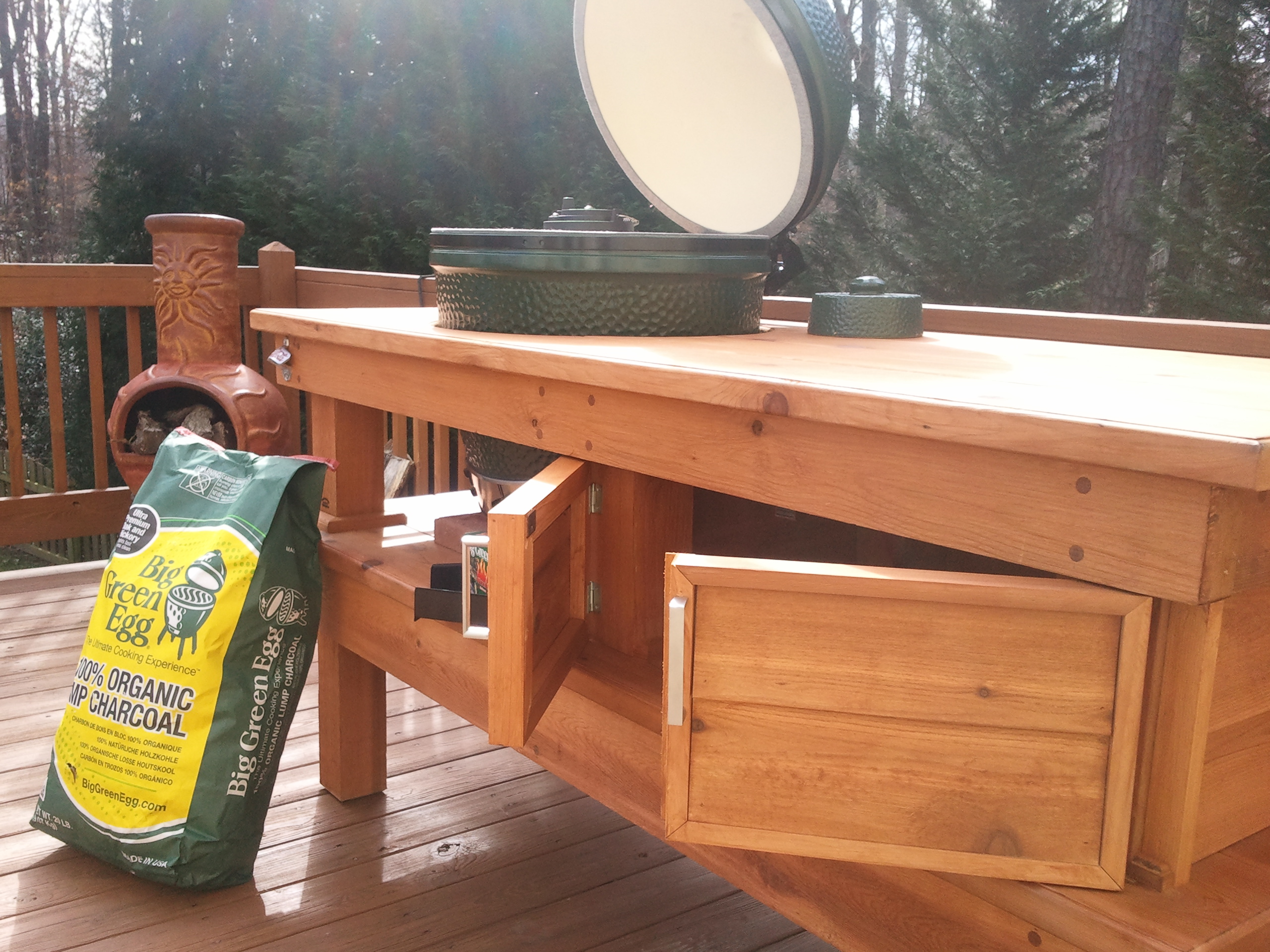 This table, a recent commission from a new client in Suwanee is a 6’x30″ table, designed and constructed for a large Big Green Egg.  For this particular owner, it is a first table, for a brand new smoker.  Exciting times for any budding “egg-head.”  Per the clients request, this table has a solid wood top, with an adjacent “dry box” to the right utilized for charcoal storage, etc.  There are a few accessories that we added to the table.  A classic Coca-Cola bottle opener and a cedar/aluminum towel bar are just a couple.  This is a very sturdy table, constructed entirely of cedar, stainless fasteners…all hidden by shop-made redwood plugs.  The final finish is a cedar tone wood sealer.  Properly cared for, this table will last a lifetime…