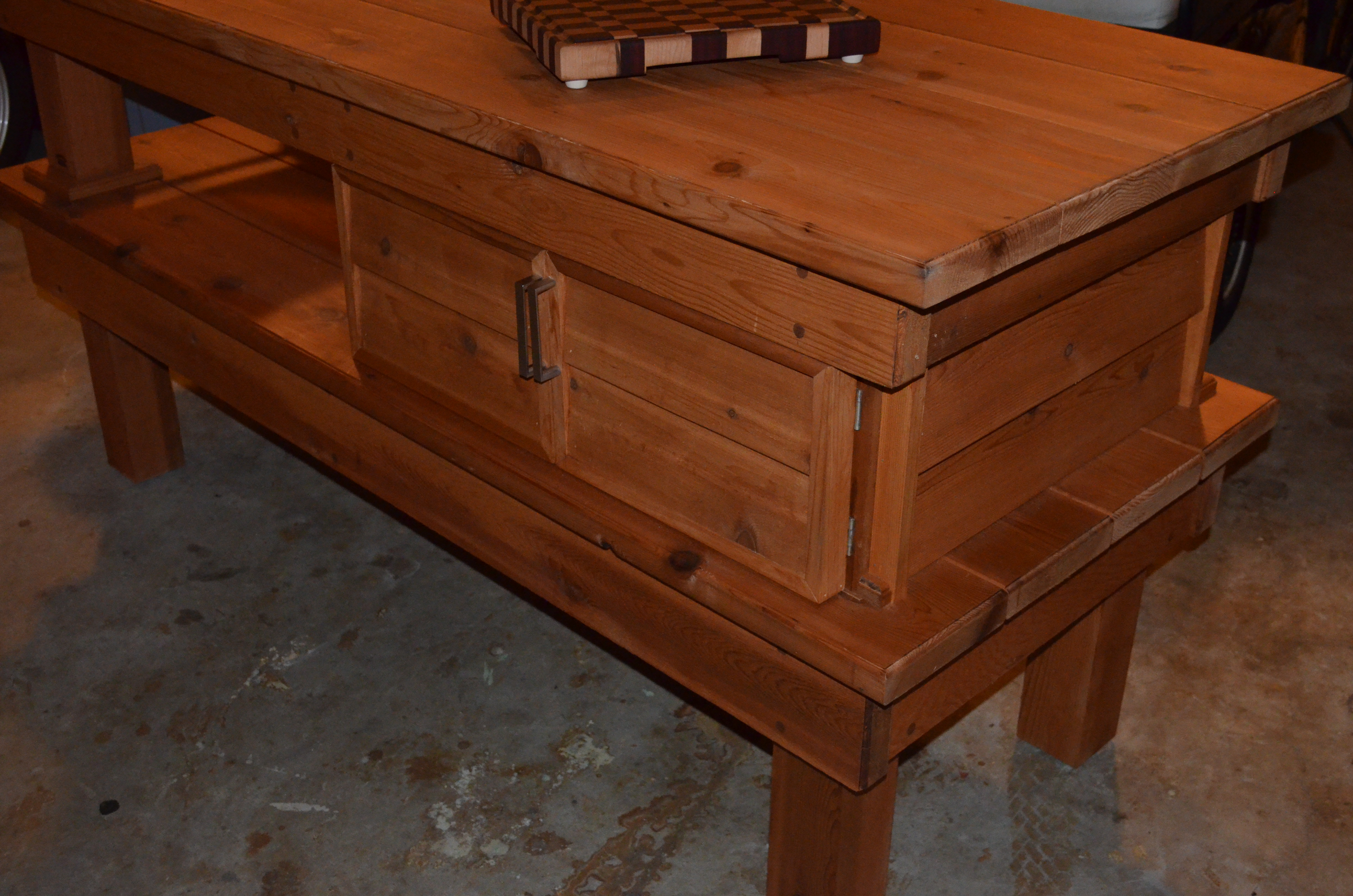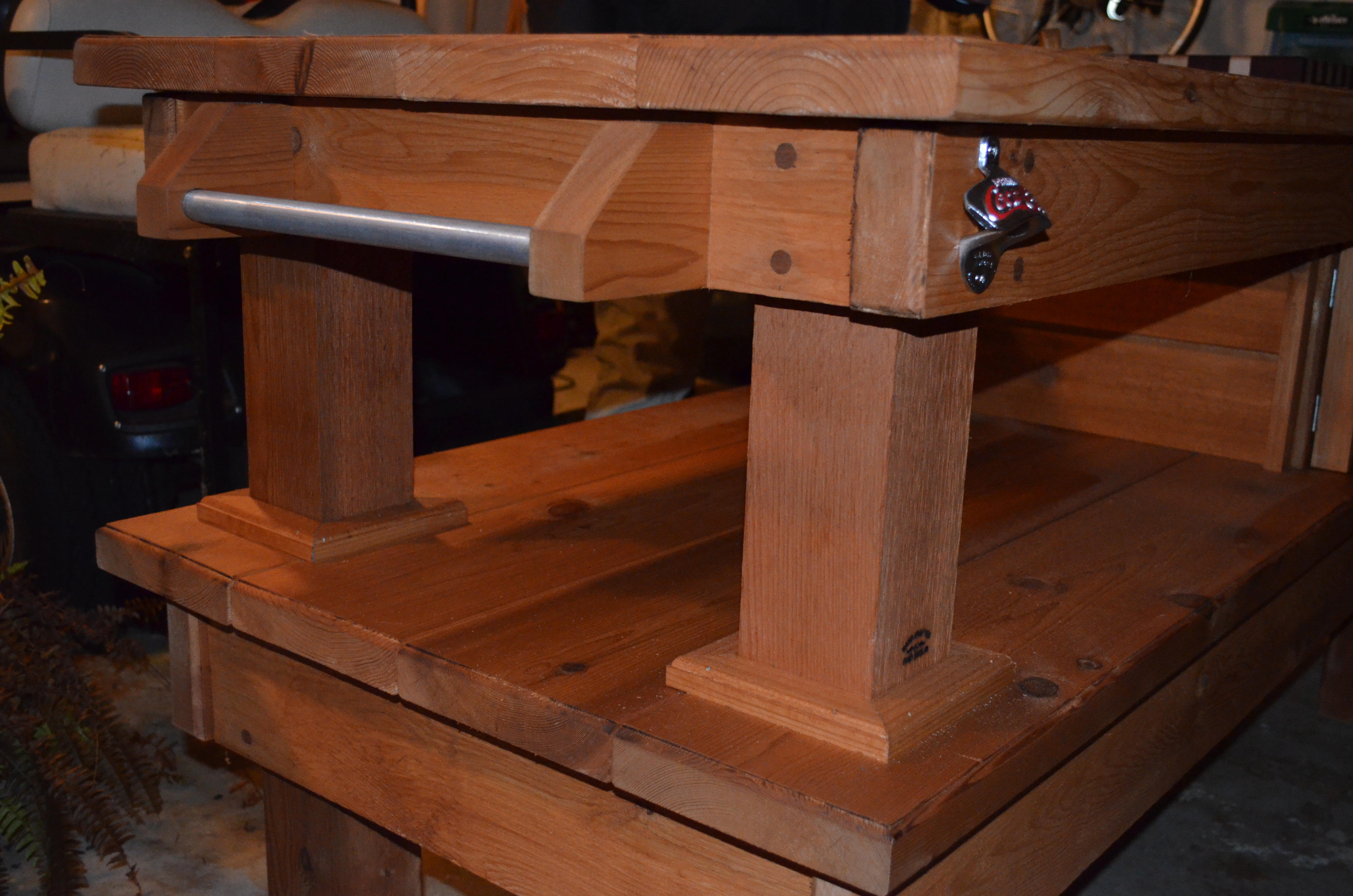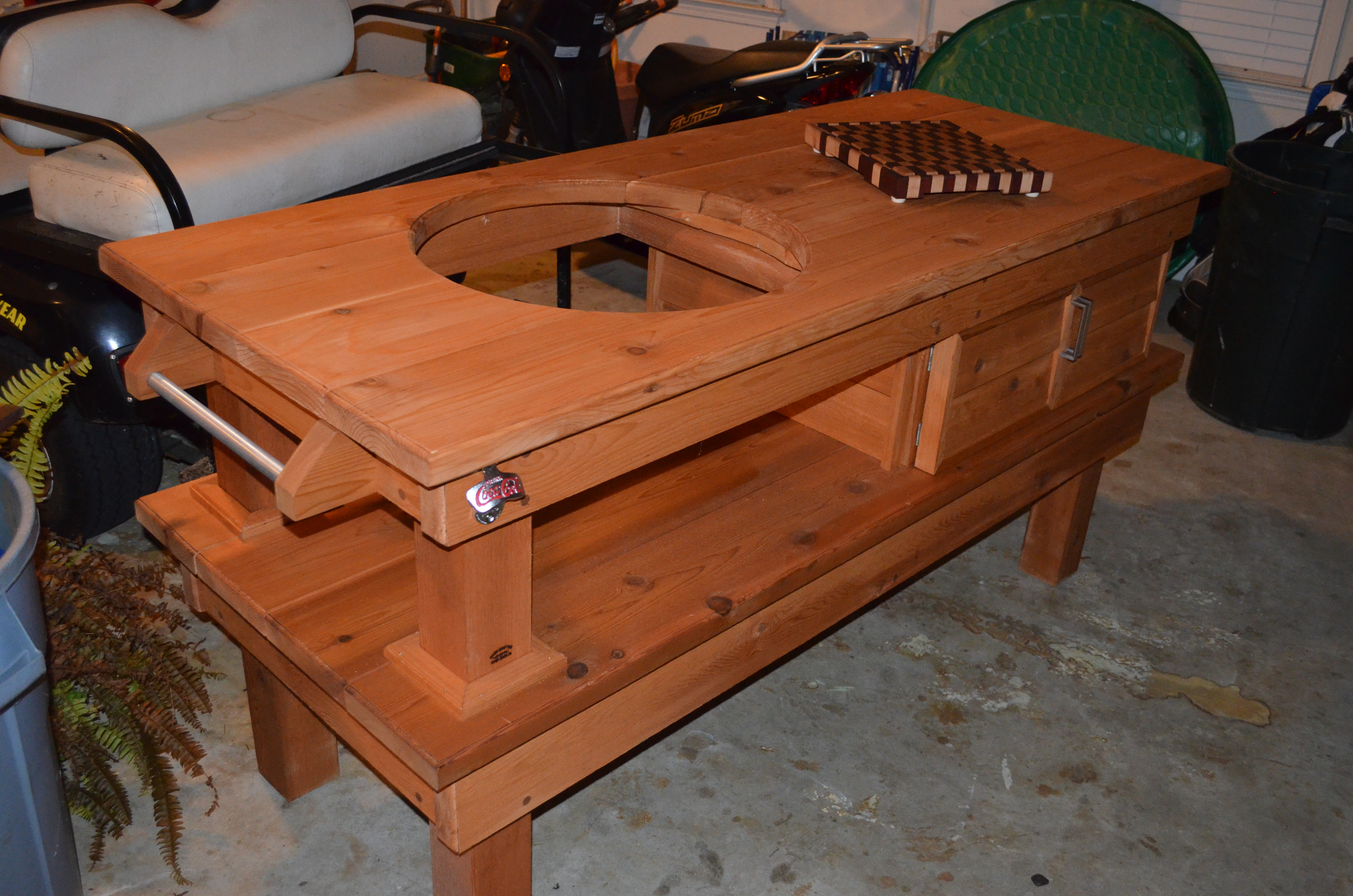 This table, a recent commission from a new client in Suwanee is a 6’x30″ table, designed and constructed for a large Big Green Egg.  For this particular owner, it is a first table, for a brand new smoker.  Exciting times for any budding “egg-head.”  Per the clients request, this table has a solid wood top, with an adjacent “dry box” to the right utilized for charcoal storage, etc.  There are a few accessories that we added to the table.  A classic Coca-Cola bottle opener and a cedar/aluminum towel bar are just a couple.  This is a very sturdy table, constructed entirely of cedar, stainless fasteners…all hidden by shop-made redwood plugs.  The final finish is a cedar tone wood sealer.  Properly cared for, this table will last a lifetime…
