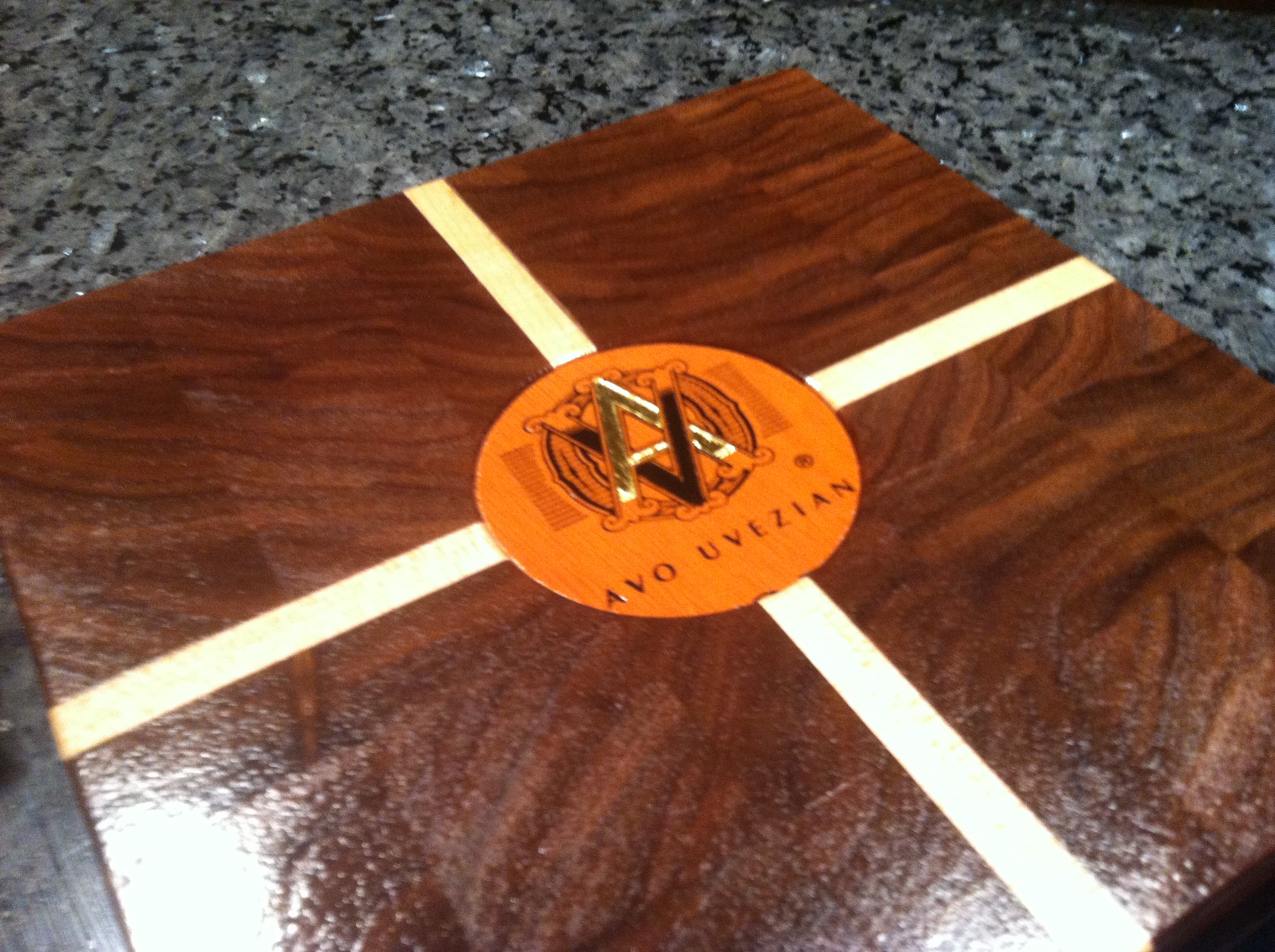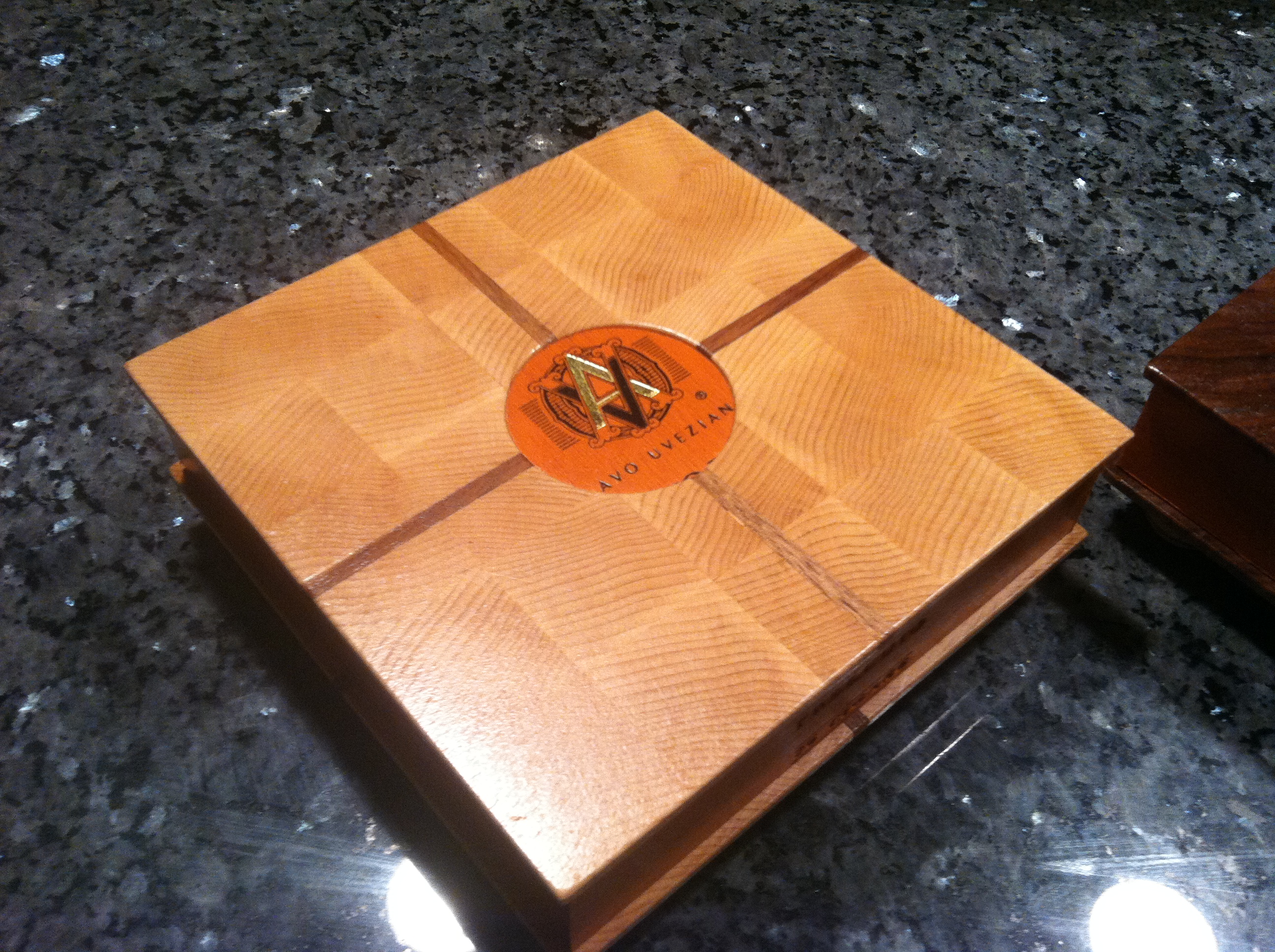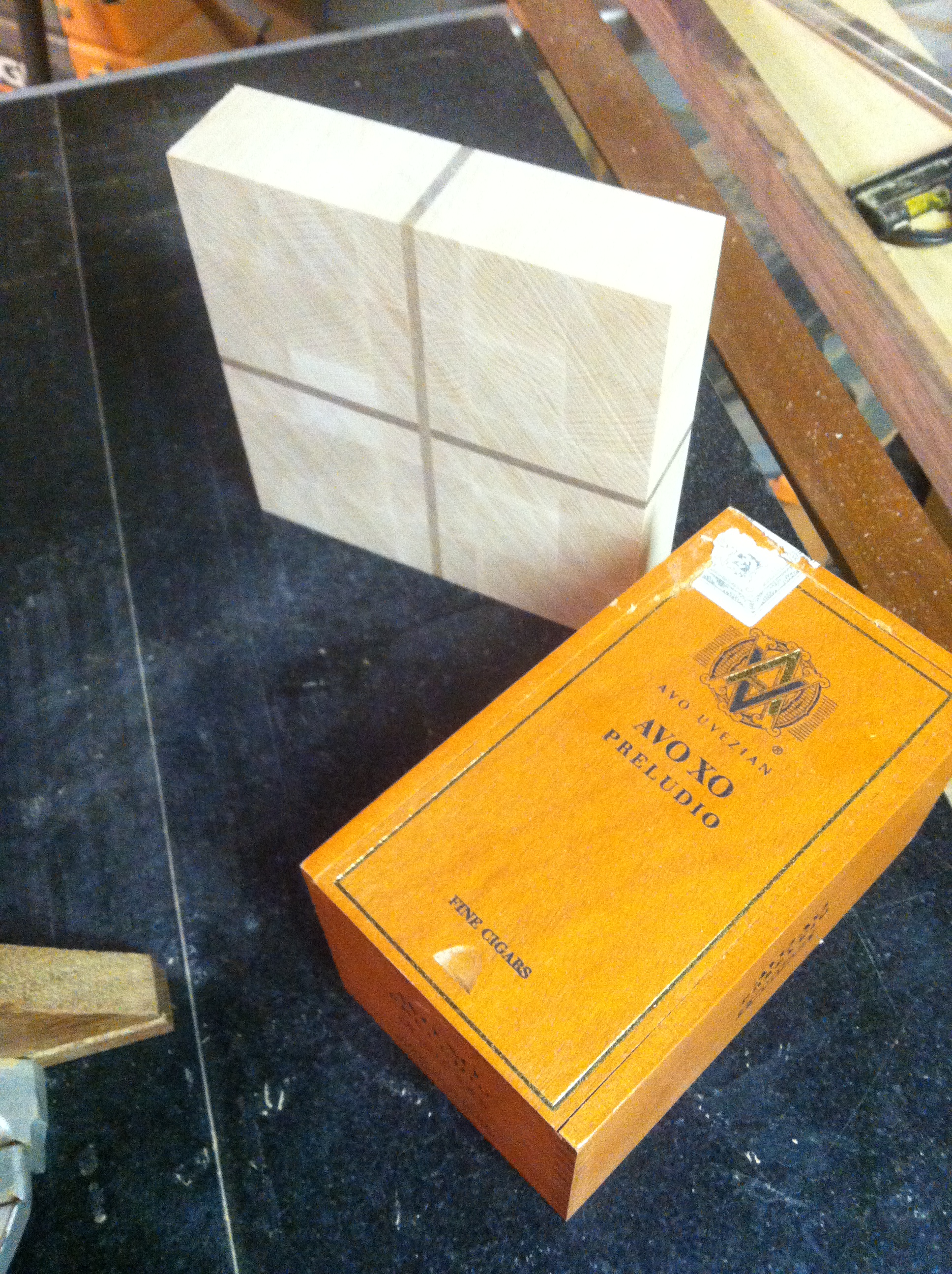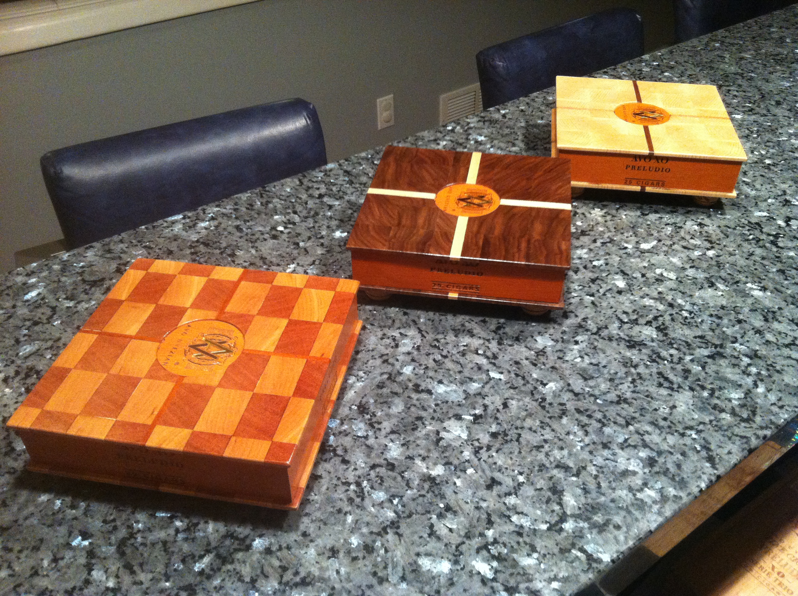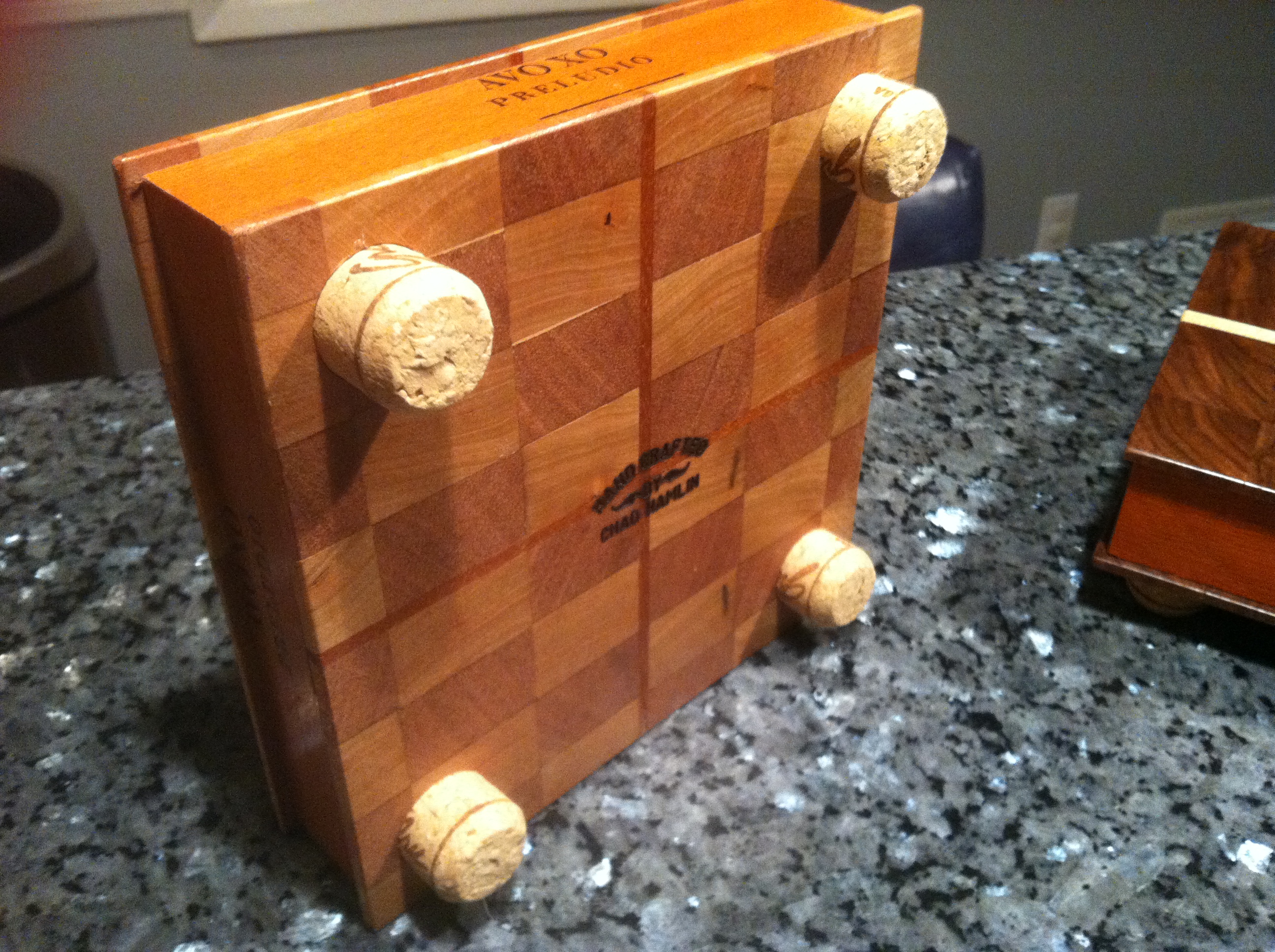 This was a very unique project.  The client, a wine and cigar afficianado, was looking for a way to proudly display wine at the dining room table, without having any drips causing damage to the table linens.  The client came to me and asked if I would be able to adopt practices used with my cutting boards while introducing unique properties that made it custom taylored to their interests.  He gave me a stack of empty cigar boxes (well, almost empty…I found one remaining cigar in one of the boxes!)  He asked if i could incorporate them into the design.  Honestly, at the time, i wasnt sure what i was going to do.  I sat on it for a few weeks.  The end result was a series of display platforms that are each unique; however, follow a consistent theme. In the series, i used Walnut, Maple, Cherry and a little bit of Mahogany.  Incorporating the cigar boxes took some thought.  Ultimately, I took each of the miniature cutting boards (6 1/2″x6 1/2″), rabbeted the edges and selected a portion from the sides of the cigar boxes to inset into the edges.  The cigar boxes are made of spanish cedar, which is a very soft material.  Very tricky to work with.  For the top, cut out a 2″ medallian from the top of the cigar box and recessed it into the top of the display.  I didnt want to use my typical rubber feet for the bottom, so i decided to recess four wine corks into the bottom.  They are finished with several coats of urethane and will hopefully be a wonderful supplement to his wife’s wonderful cooking at their next family gathering.  This was a fun and challenging project.  I am already working on ideas for version 2 of these so if you are interested, let me know.  Thanks for viewing.