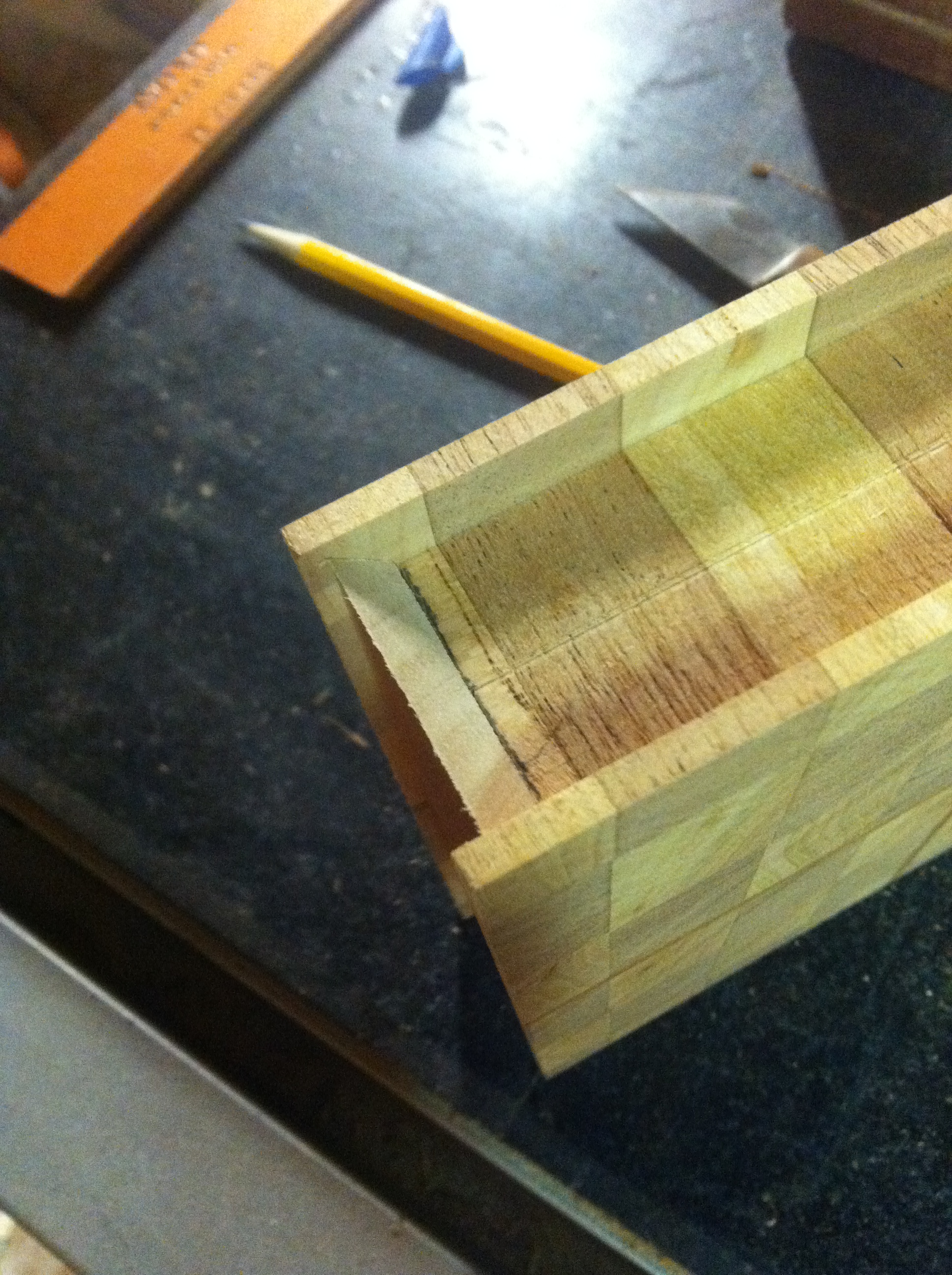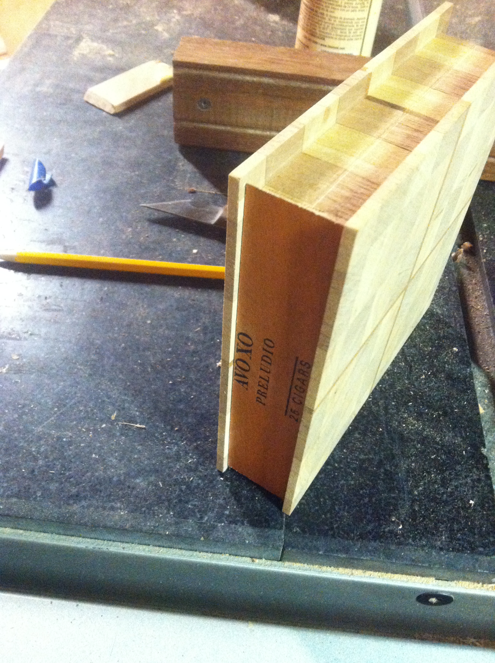 Look closely to the left, you will see the mitered corner of the cigar box.  I continued this on all 4 sides and glued them in place.