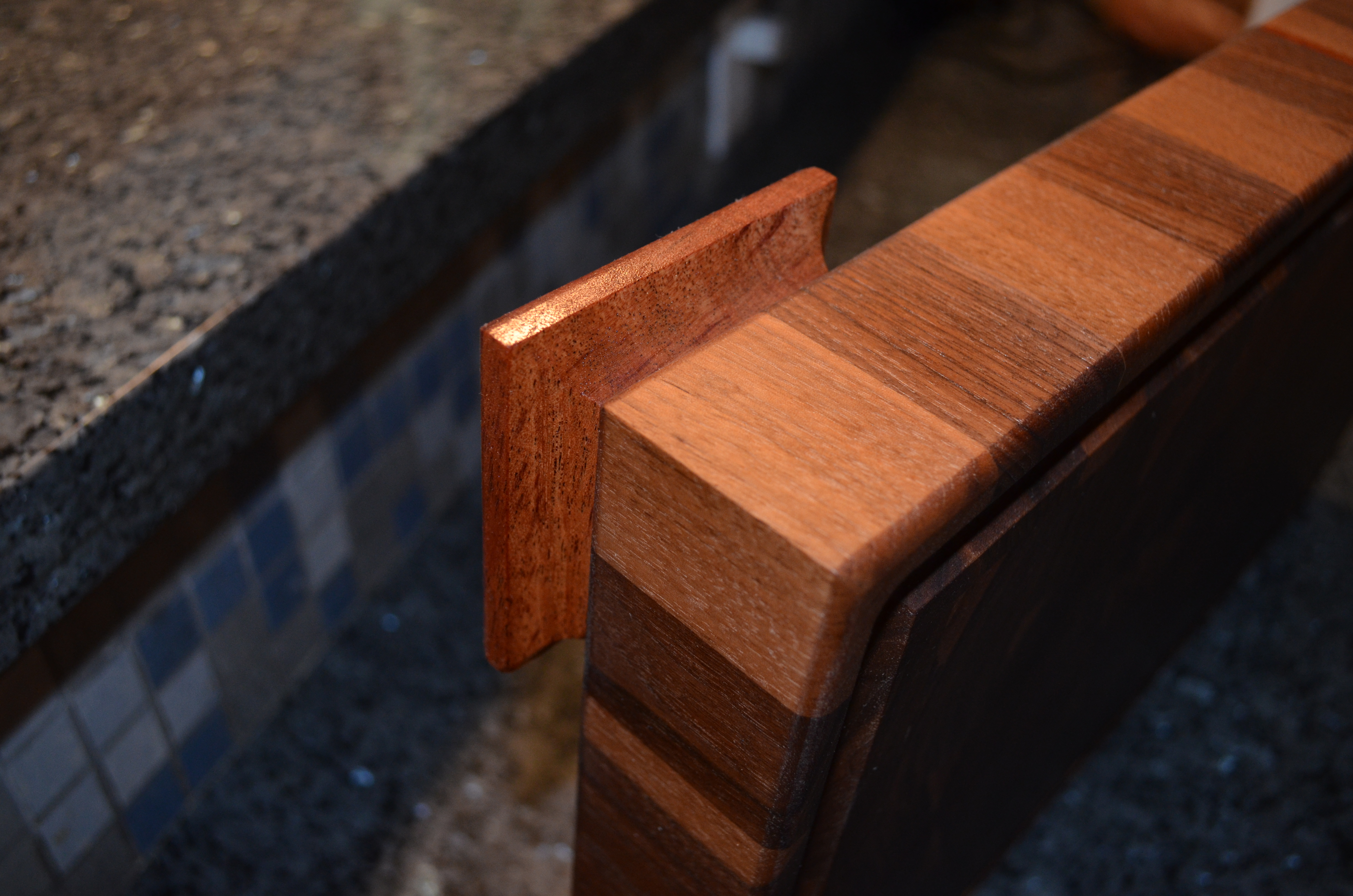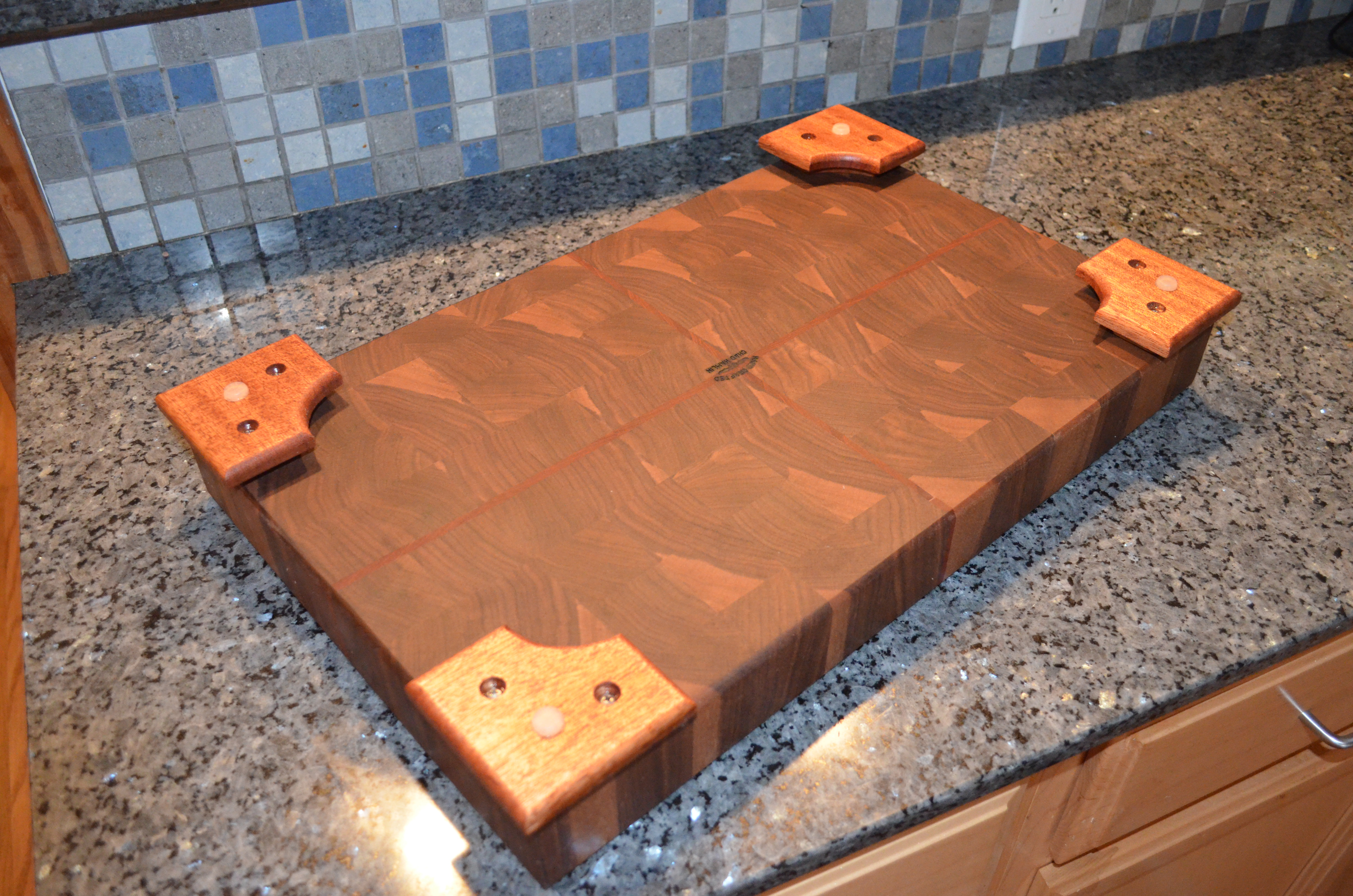 This is one of two, new style of cutting board that I am working on.  This board was made for a client that is building a new home and wanted a kitchen center piece.  The board itself measures 13″x20″ and is a full 2 1/4″ thick.  It is extremely heavy duty and weighs nearly 15 lbs.  If you look closely, you will see that hidden within the walnut is a cross hair of mahogany.  I also matched the mahogany in the feet that are installed on the bottom.  I wanted this cutting board to be sleek, yet heavy, and have a presence in the kitchen.  The feet on the bottom are different from my signature cutouts, but seemed more appropriate in this design.  With care, this board will last a lifetime.  Thanks for viewing.
