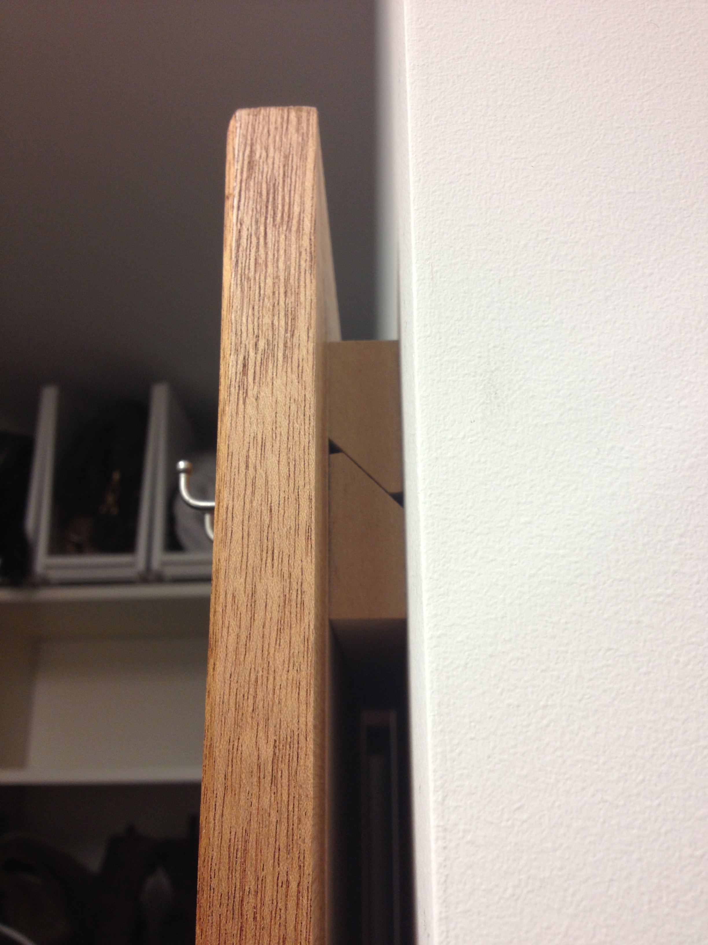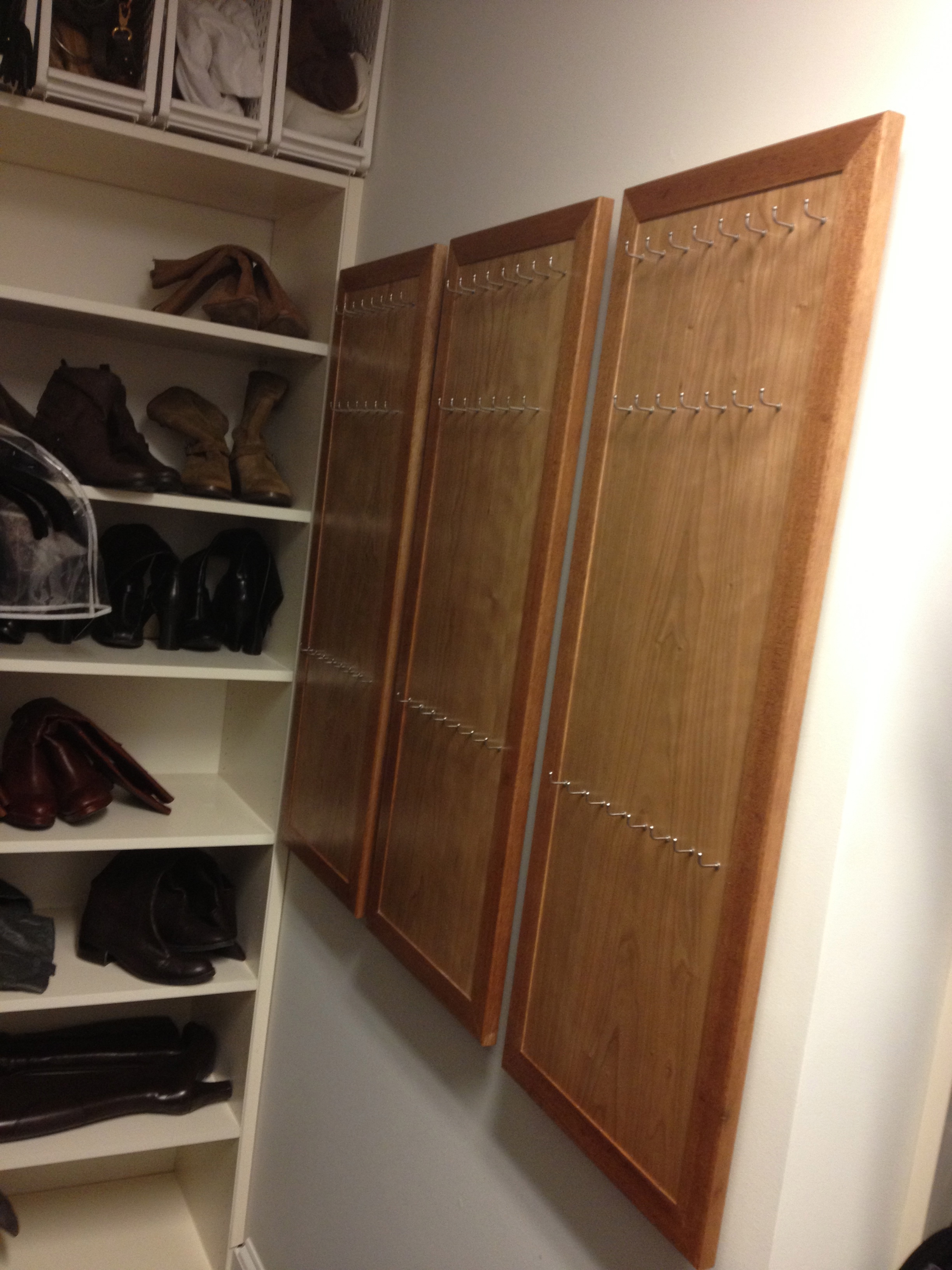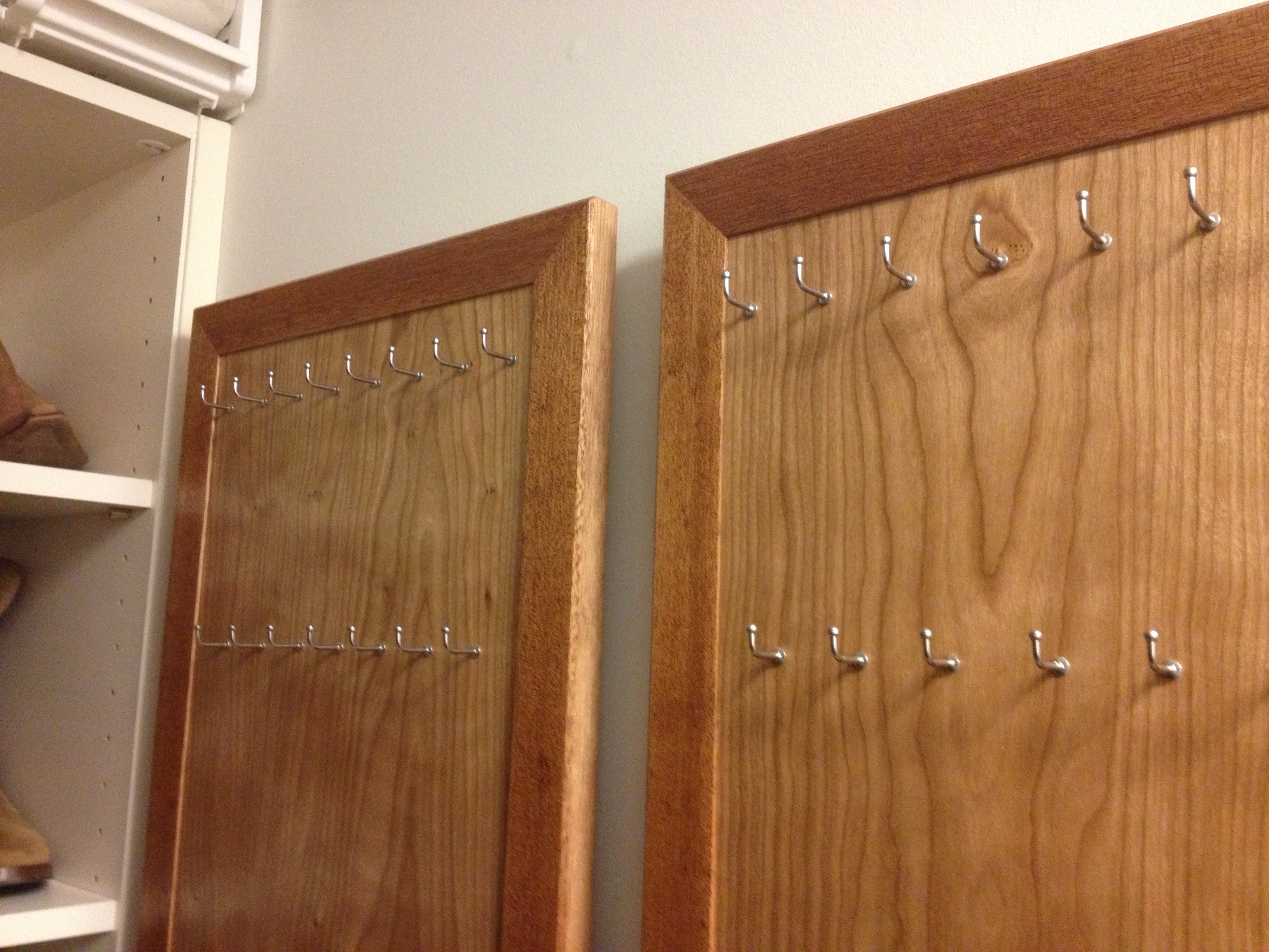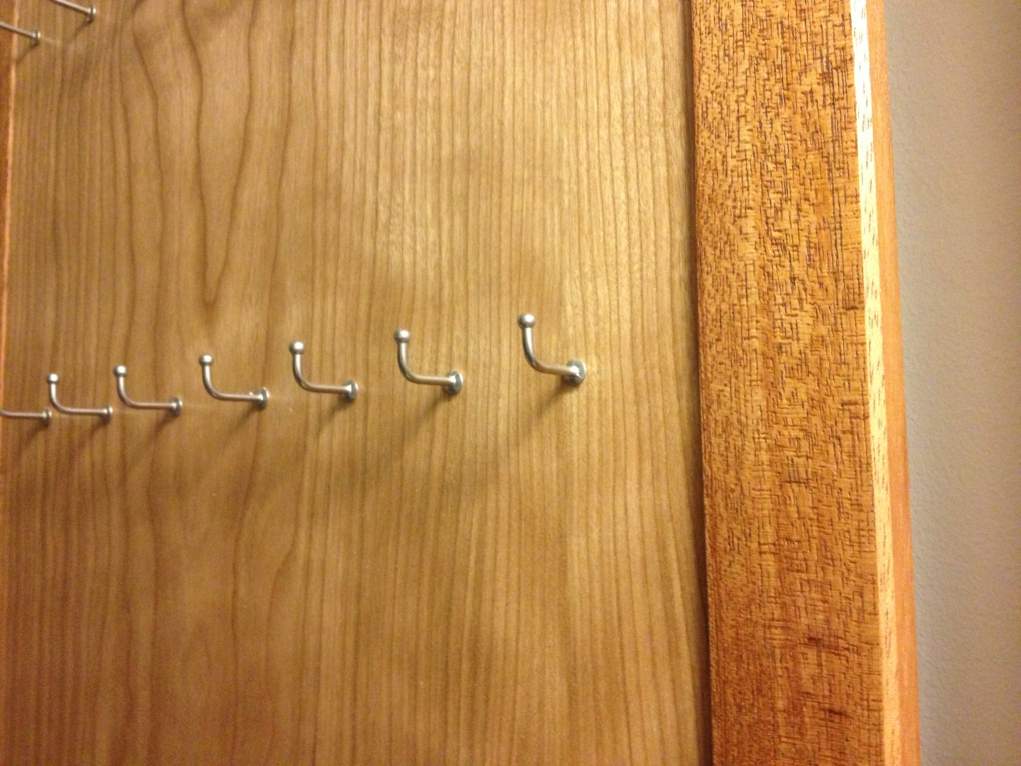 This was an interesting little project for a local client who has an affection for long necklaces. Prior to this, the necklaces would be stored in a situation where they would be tangled and unorganized. She asked me to design her some panels that would help her display her jewelry, while making them easily accessible. There are three panels, each measuring about 15″ x 40″. The panel face is made from Cherry while the surround is made from Mahogany. There are a total of 25 stainless steel, decorative hooks on each panel. Thanks for viewing.