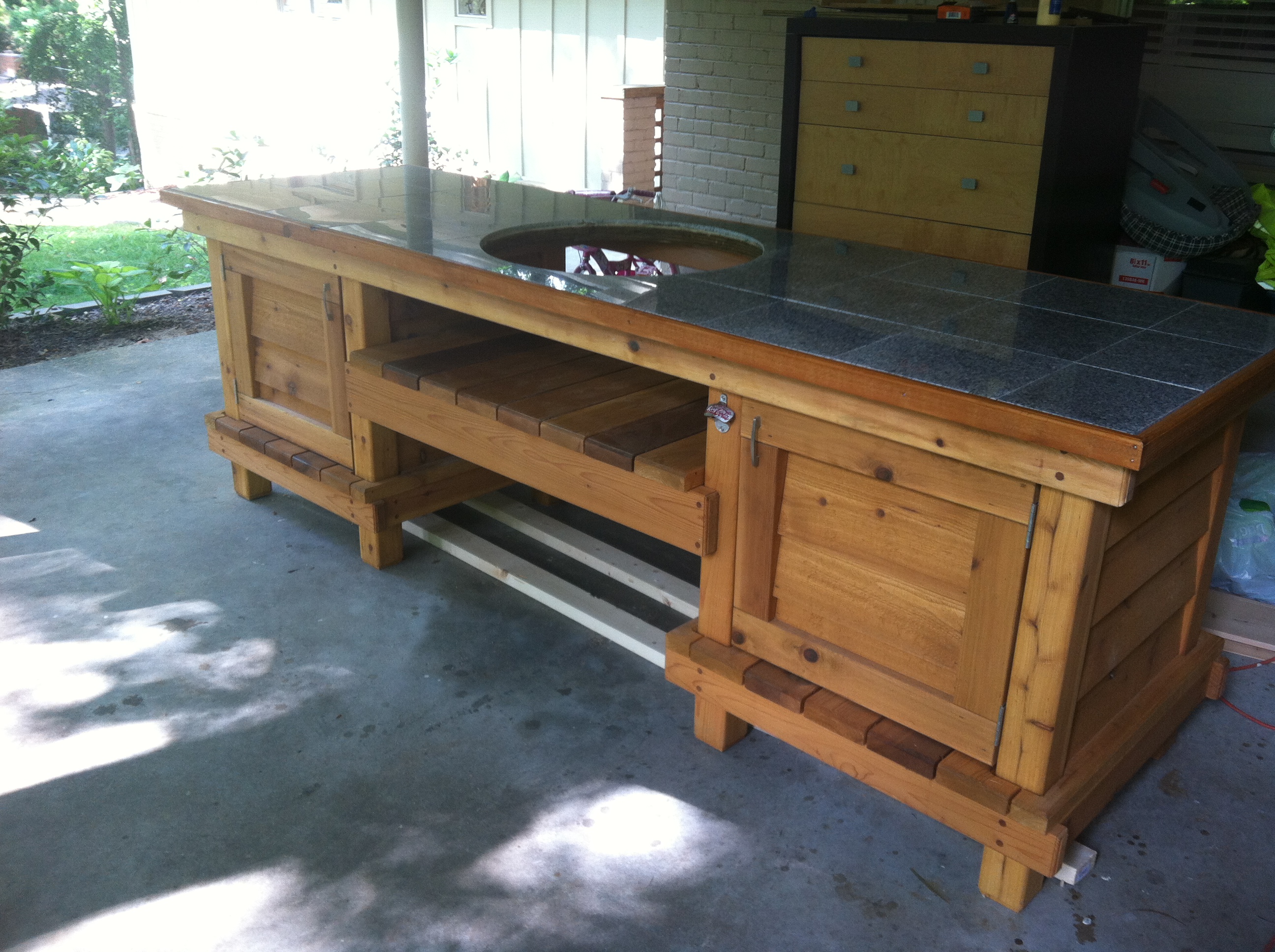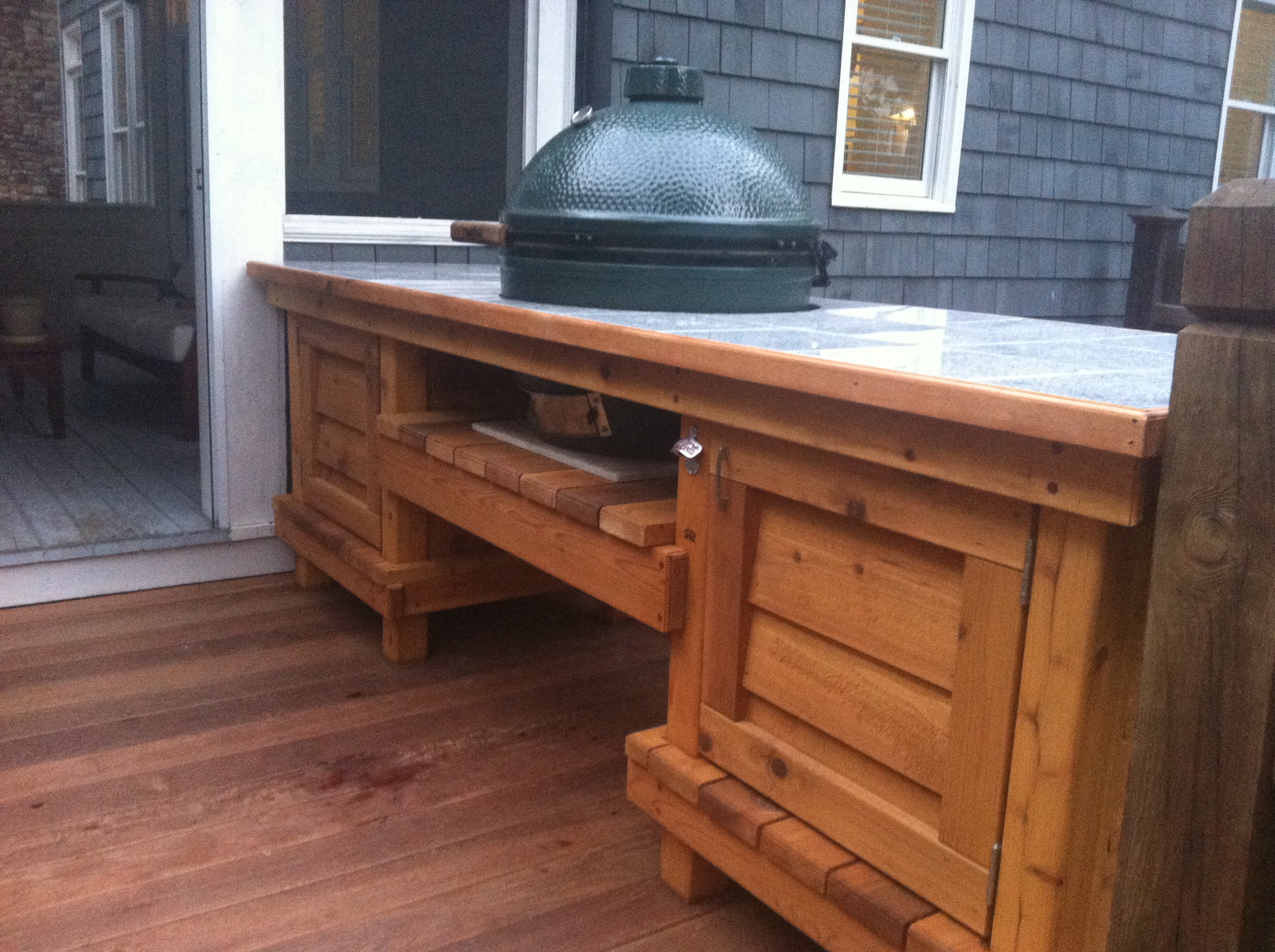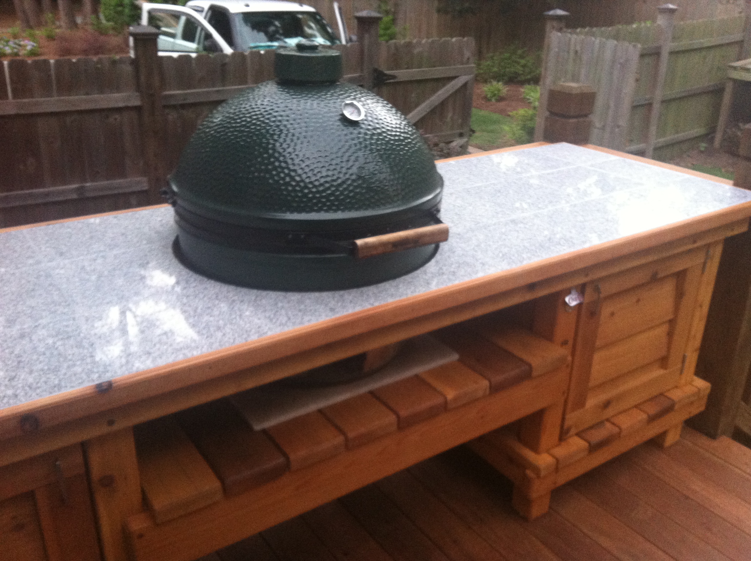 This table was recently completed for a client in Dunwoody, Ga. It measures 115″ x 36″. It is made entirely from cedar and has a two piece top designed and fabricated for easy installation, removal and reinstallation (if necessary.) The table is made for an Extra Large Big Green Egg and weighs approximately 600 lbs without the egg.
