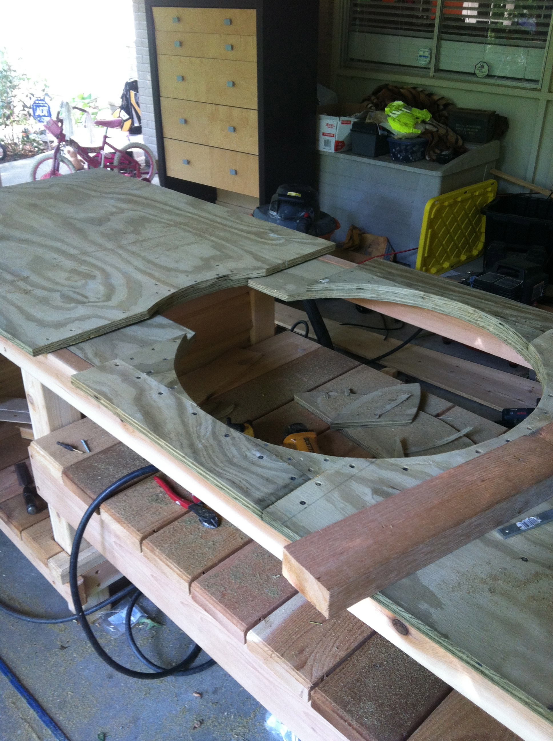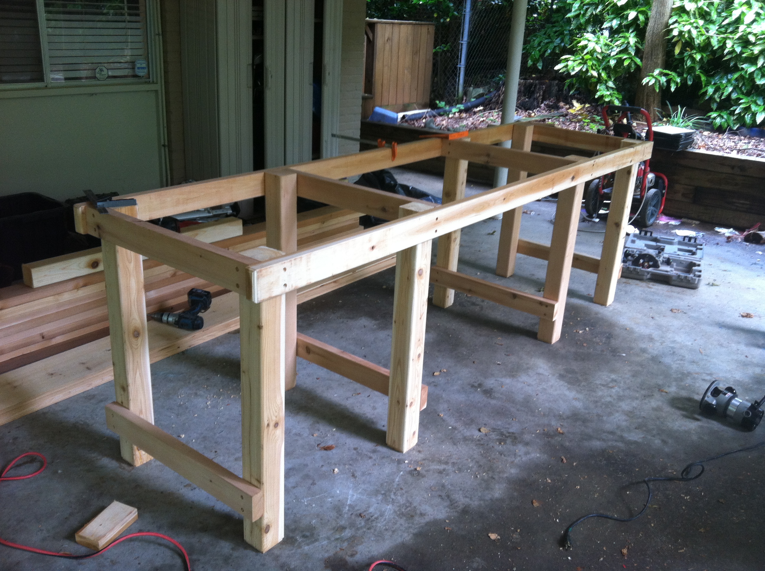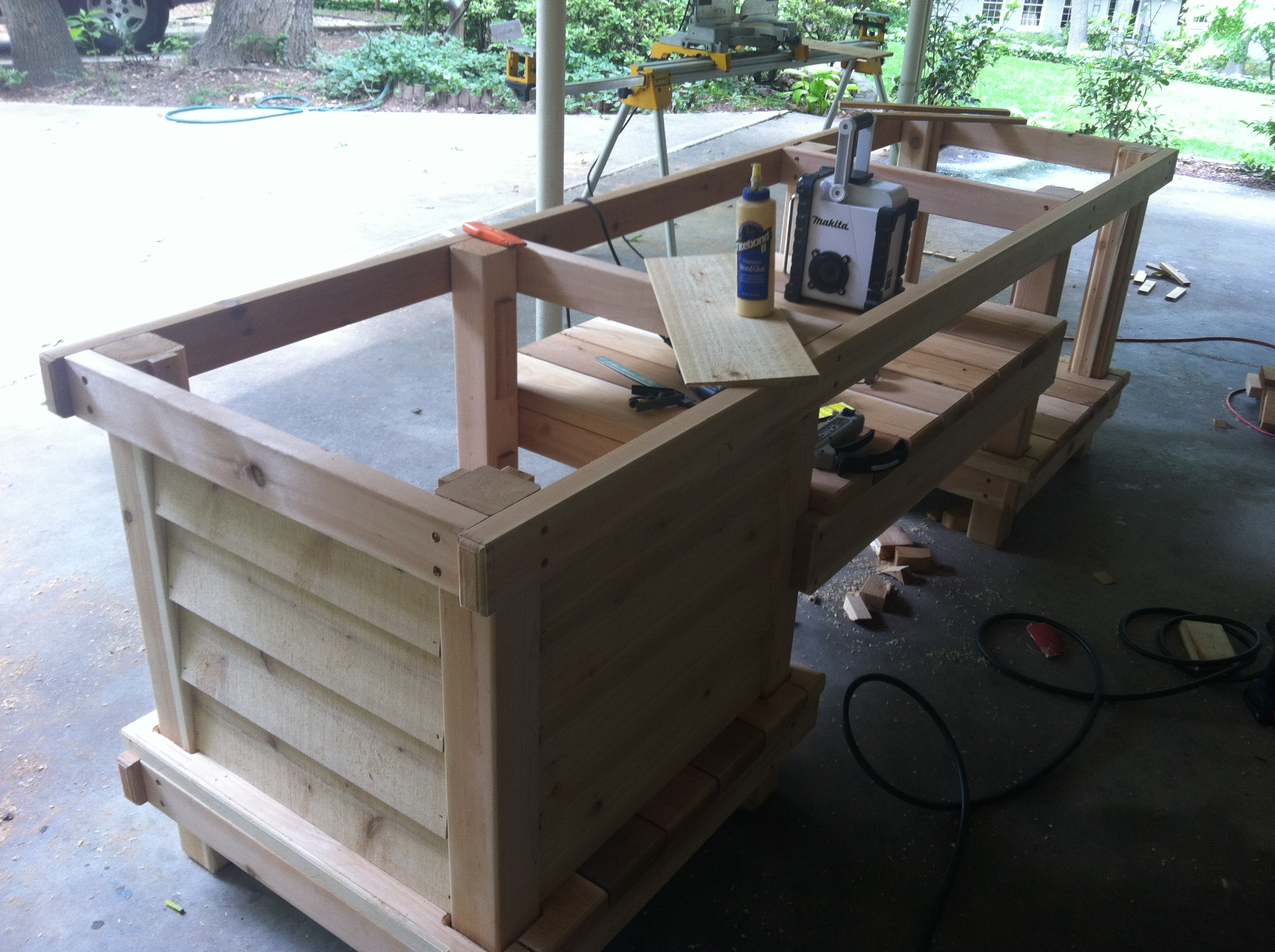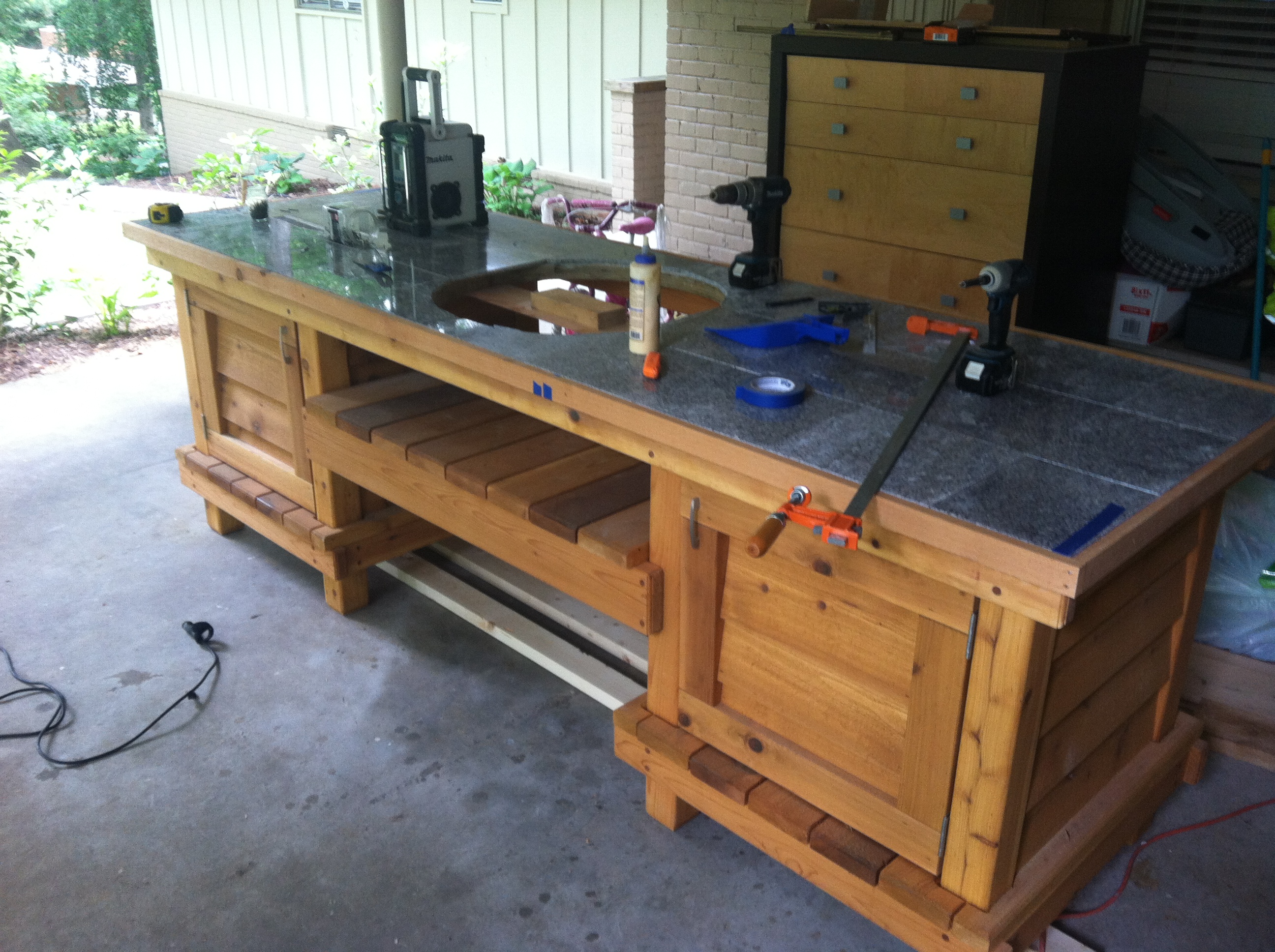 This table was recently completed for a client in Dunwoody, Ga. It measures 115″ x 36″. It is made entirely from cedar and has a two piece top designed and fabricated for easy installation, removal and reinstallation (if necessary.) The table is made for an Extra Large Big Green Egg and weighs approximately 600 lbs without the egg.