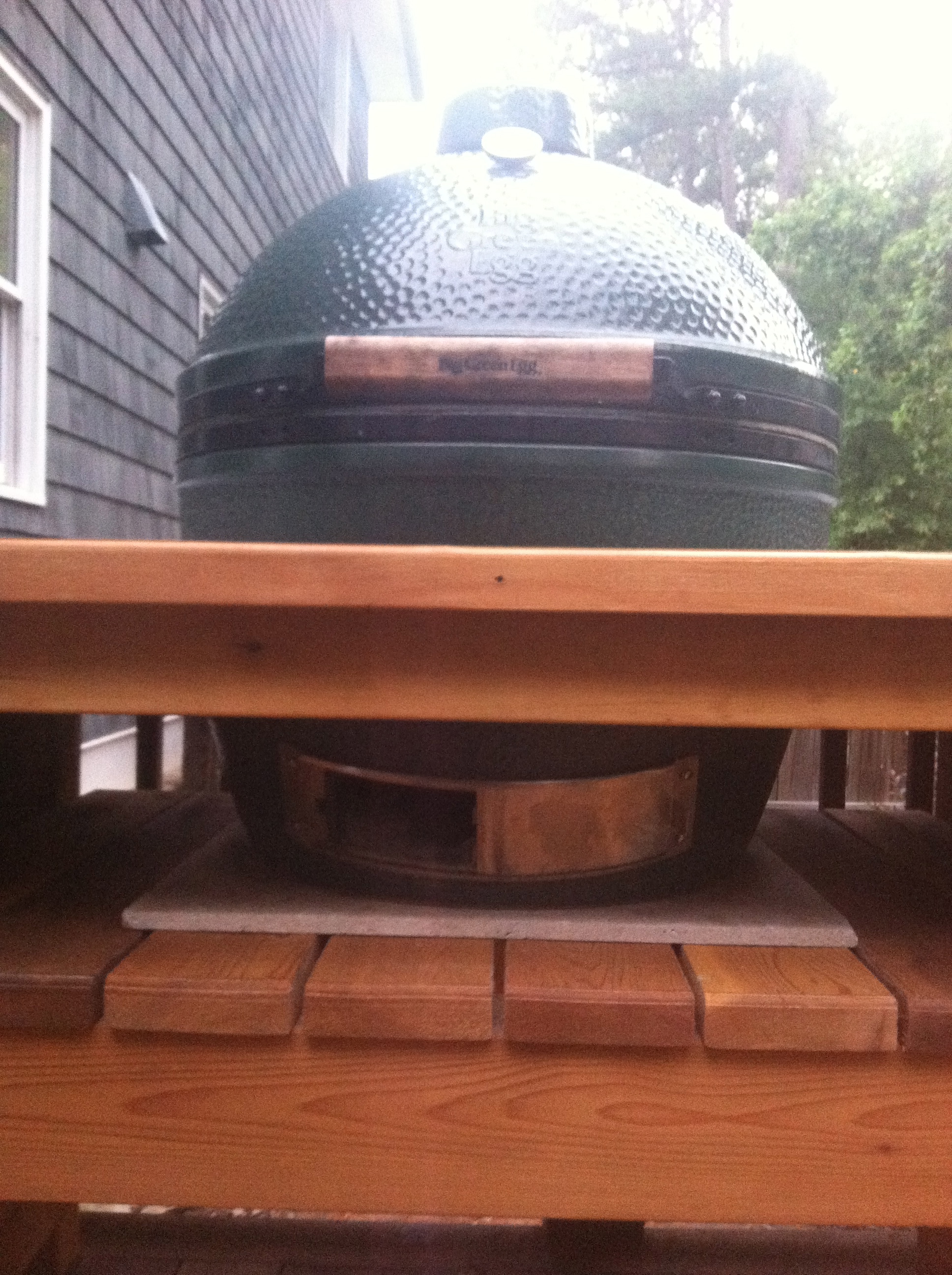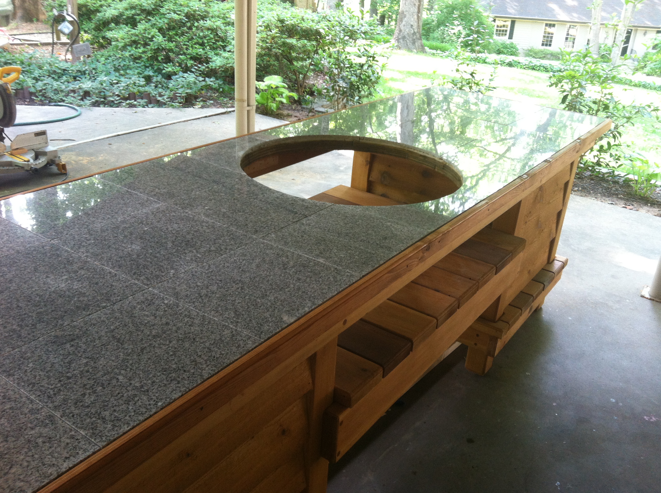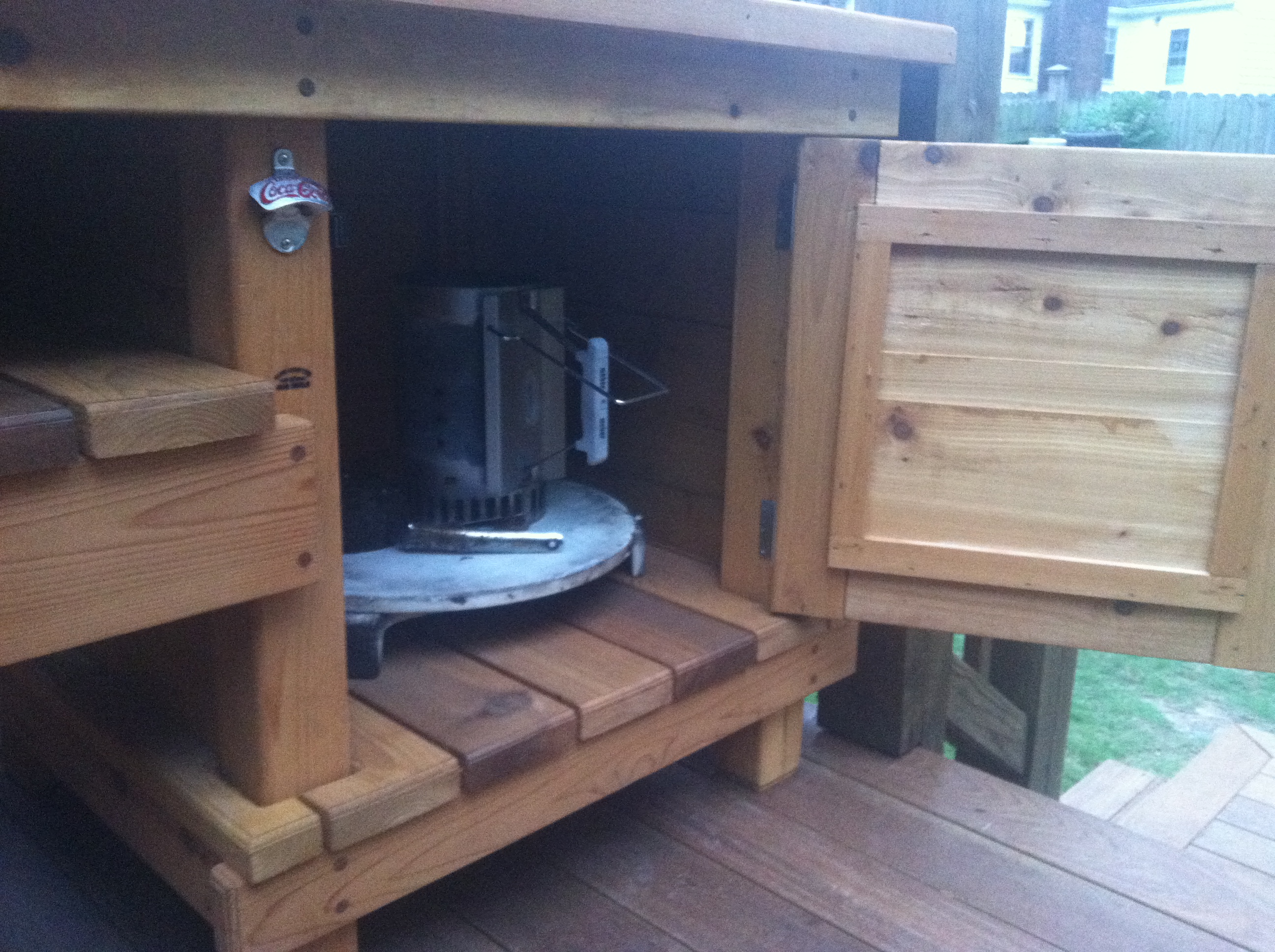 The cabinets are offset from the primary structure so that taller, more useful cabinets can be created. The center platform is built to the BGE specifications and is offset to provide proper clearance for the egg itself.