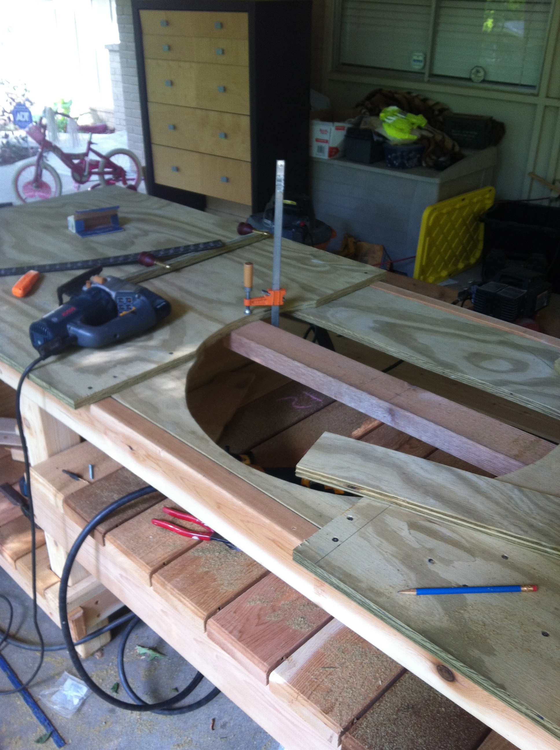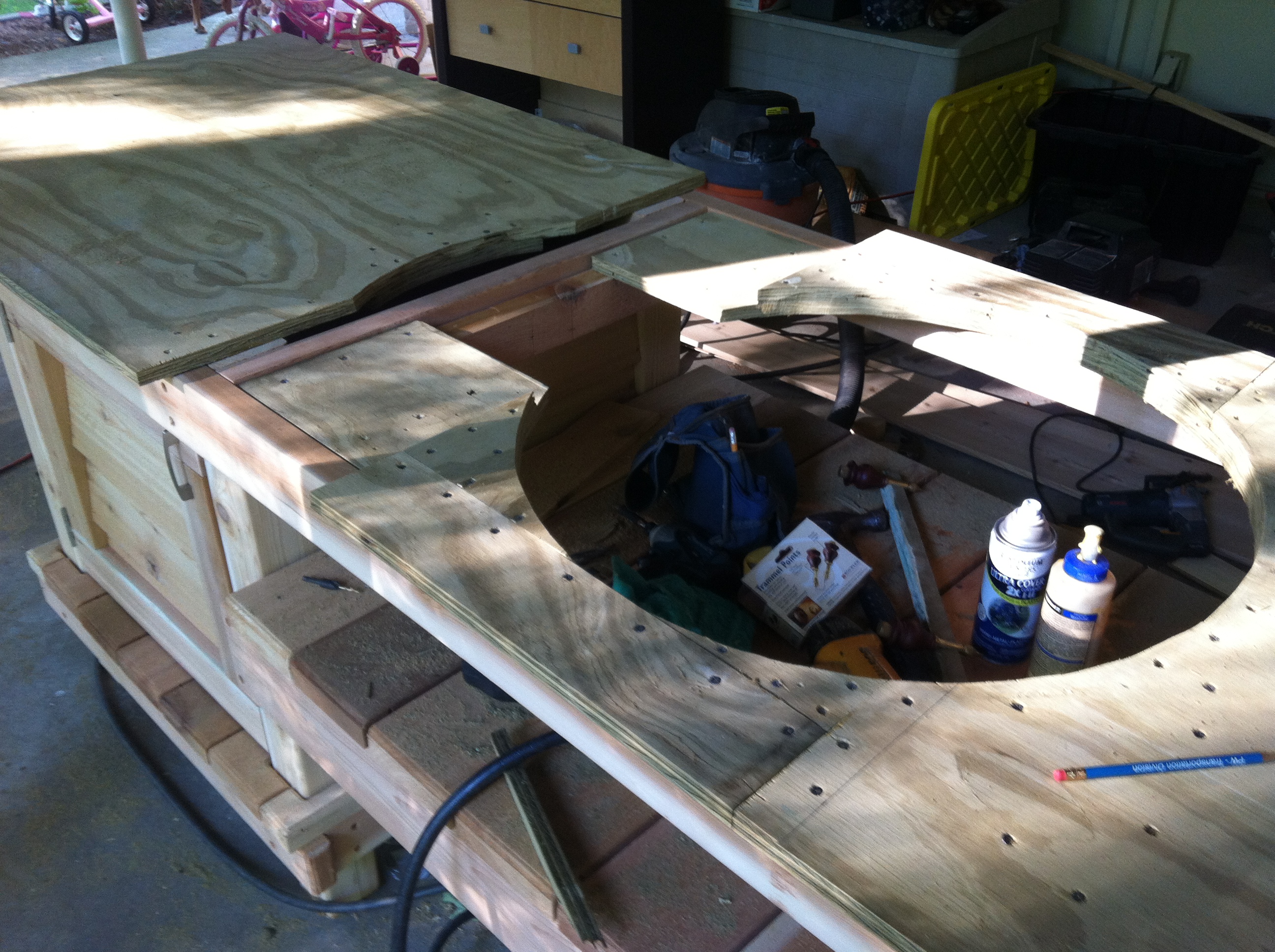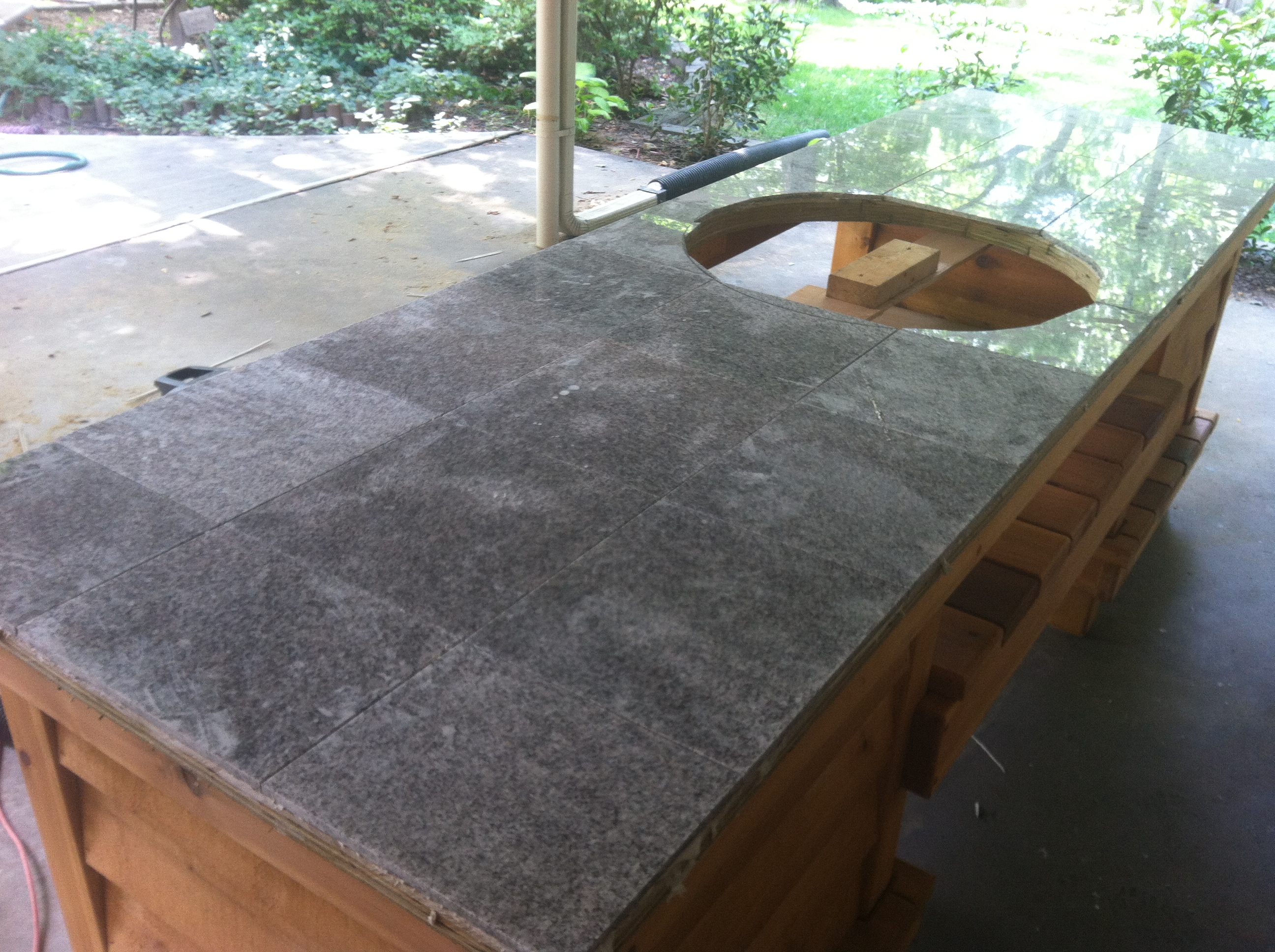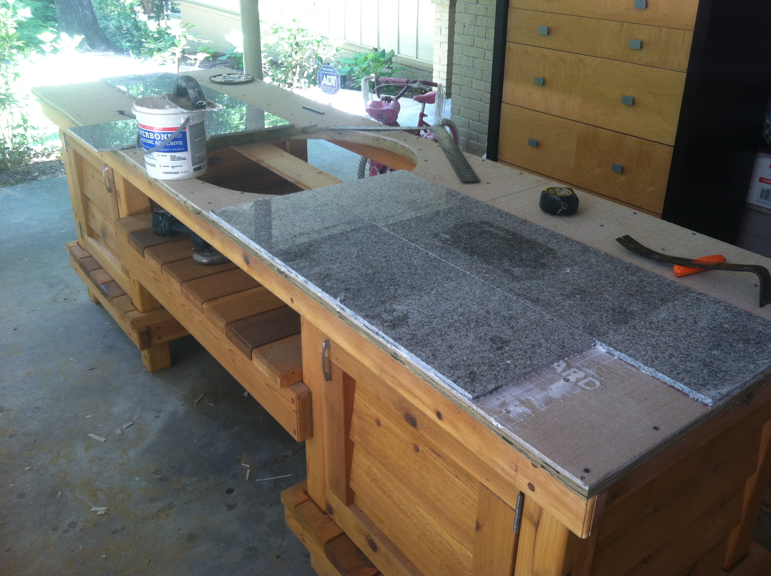 The cabinets are offset from the primary structure so that taller, more useful cabinets can be created. The center platform is built to the BGE specifications and is offset to provide proper clearance for the egg itself.