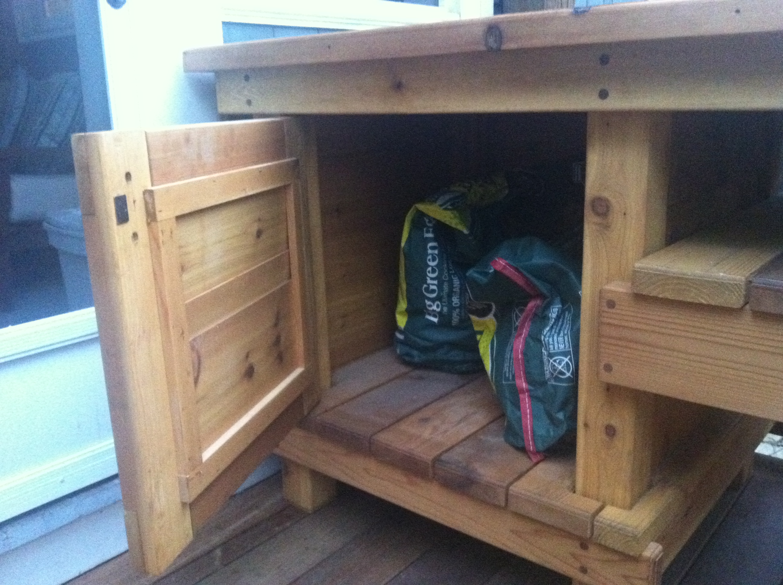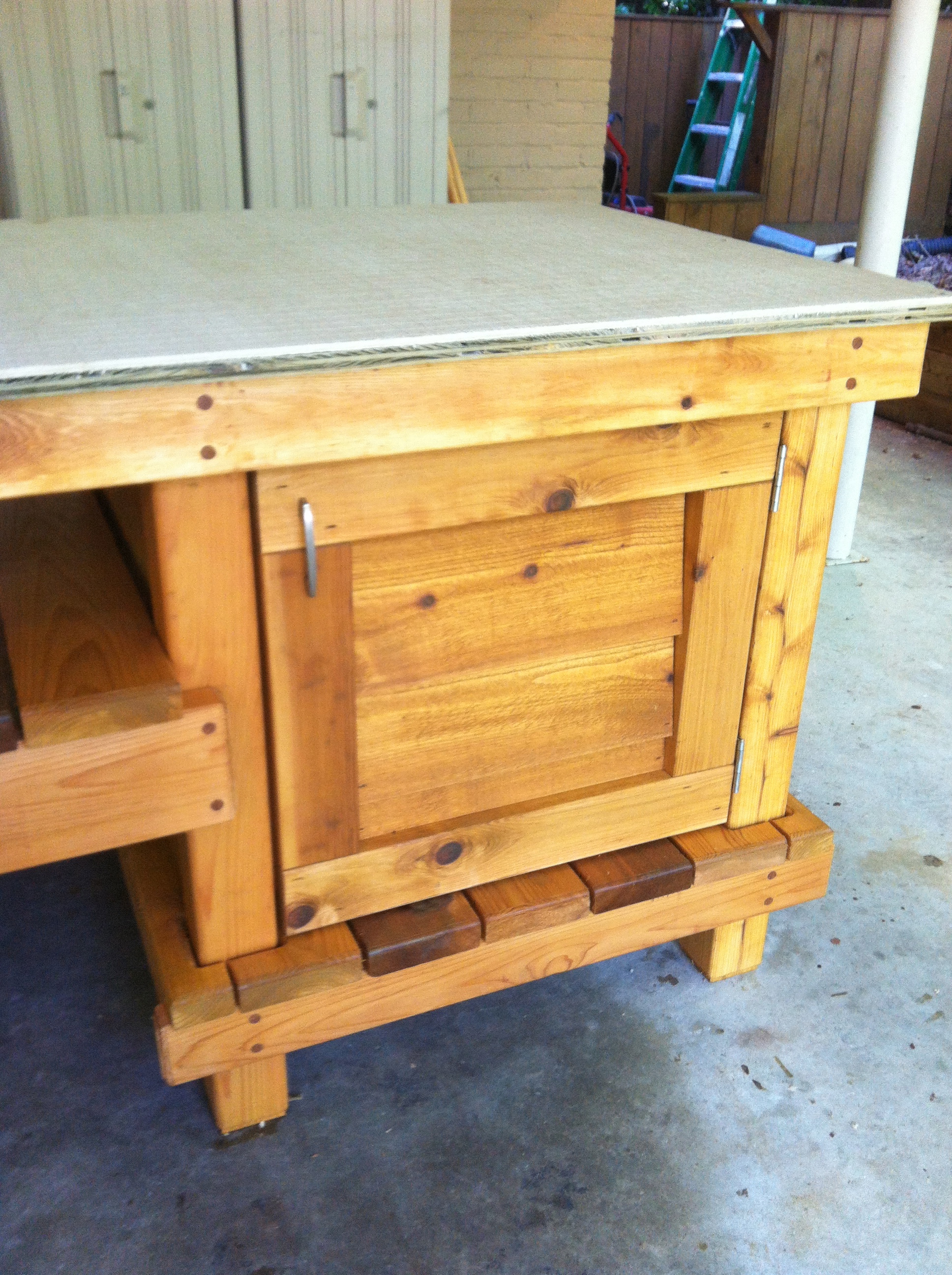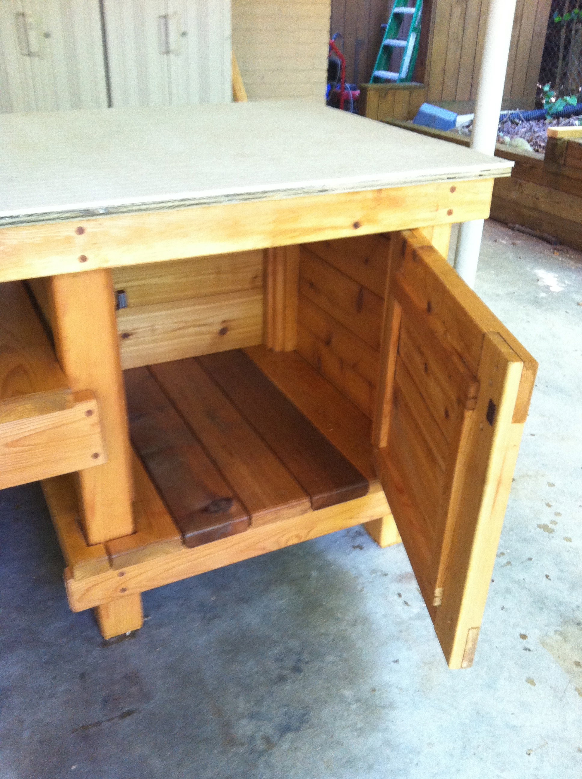 As usual, all of the fasteners are stainless, but are hidden by custom cut redwood plugs. The doors are created using “half lap” joinery, and are exceptionally strong. The table was finished off with two coats of honey gold sealer and will last a lifetime if properly cared for.