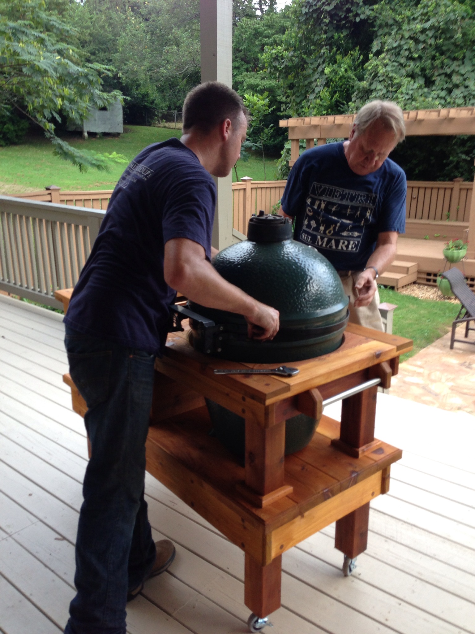A few other notes about the table…When the cooler is in place, I had to make room for the handle to spin…allowing for removal. That created a space between the table and the edge of the cooler. That looked bad and was a “trash trap.” To solve this, I built an easily removable tray that can be used for grilling tools, matches, bottle openers…what have you. Beyond that, I used a different design for the top, simply because I was tired of doing the same thing. This design uses a “half lap” joint at the corners and picture frames the top.