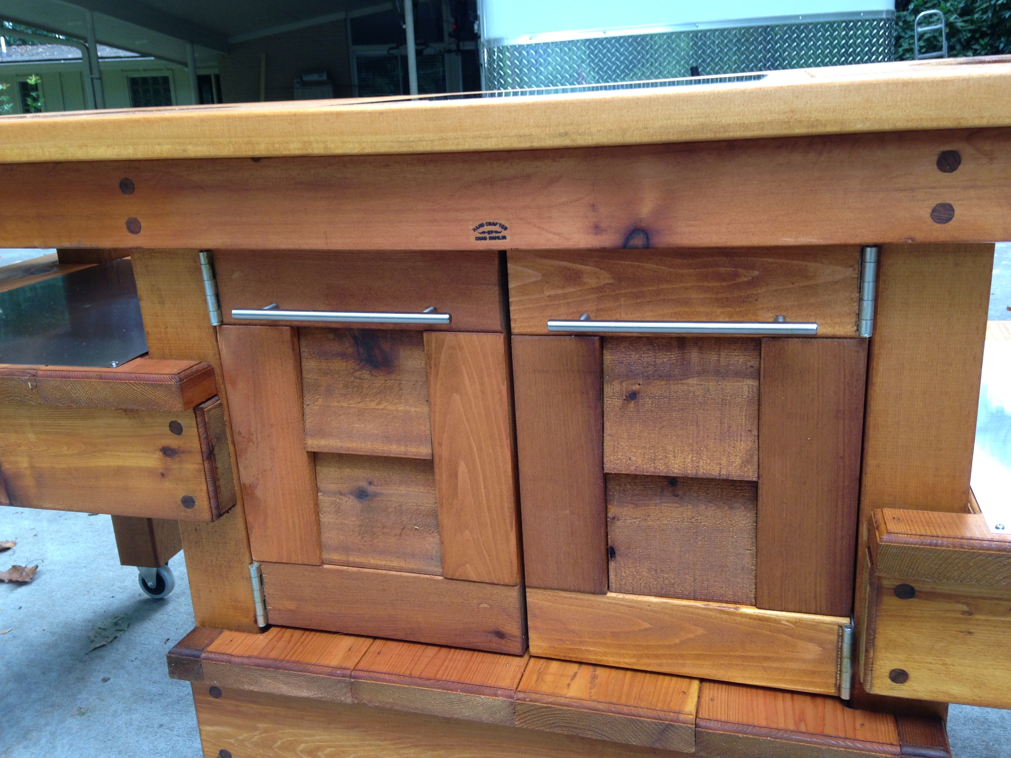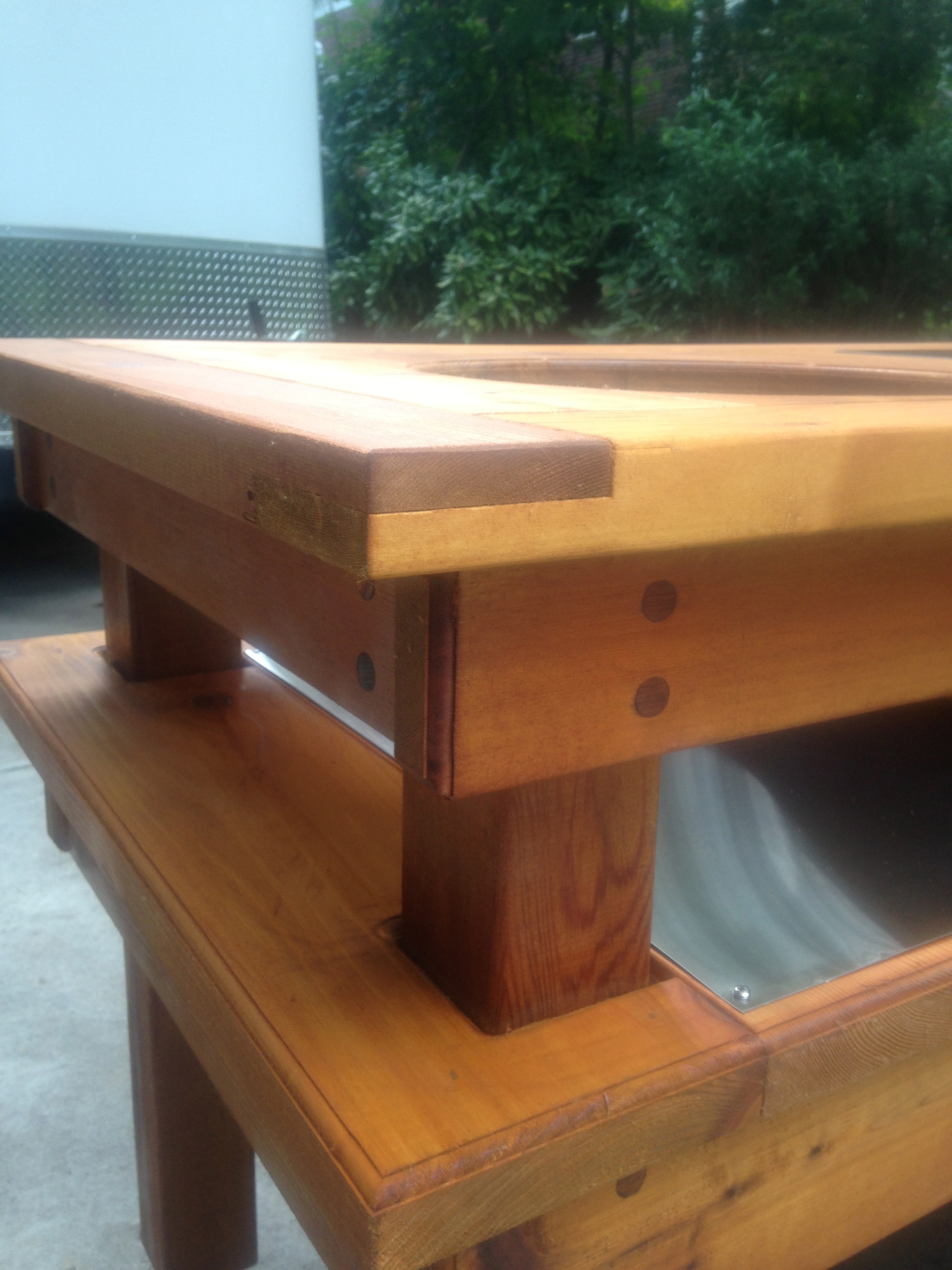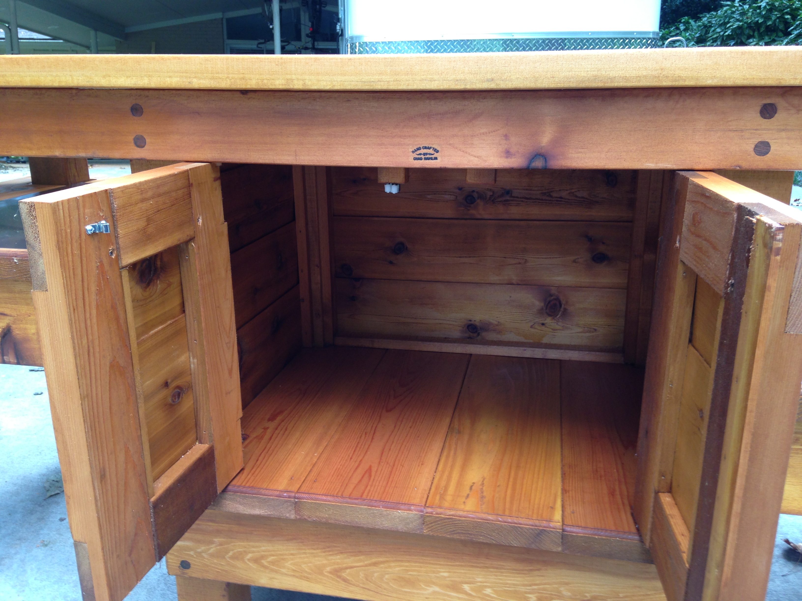 As usual, all of the fasteners are stainless, but are hidden by custom cut redwood plugs. The table was finished off with two coats of cedar tone TWP sealer and will last a lifetime if properly cared for.