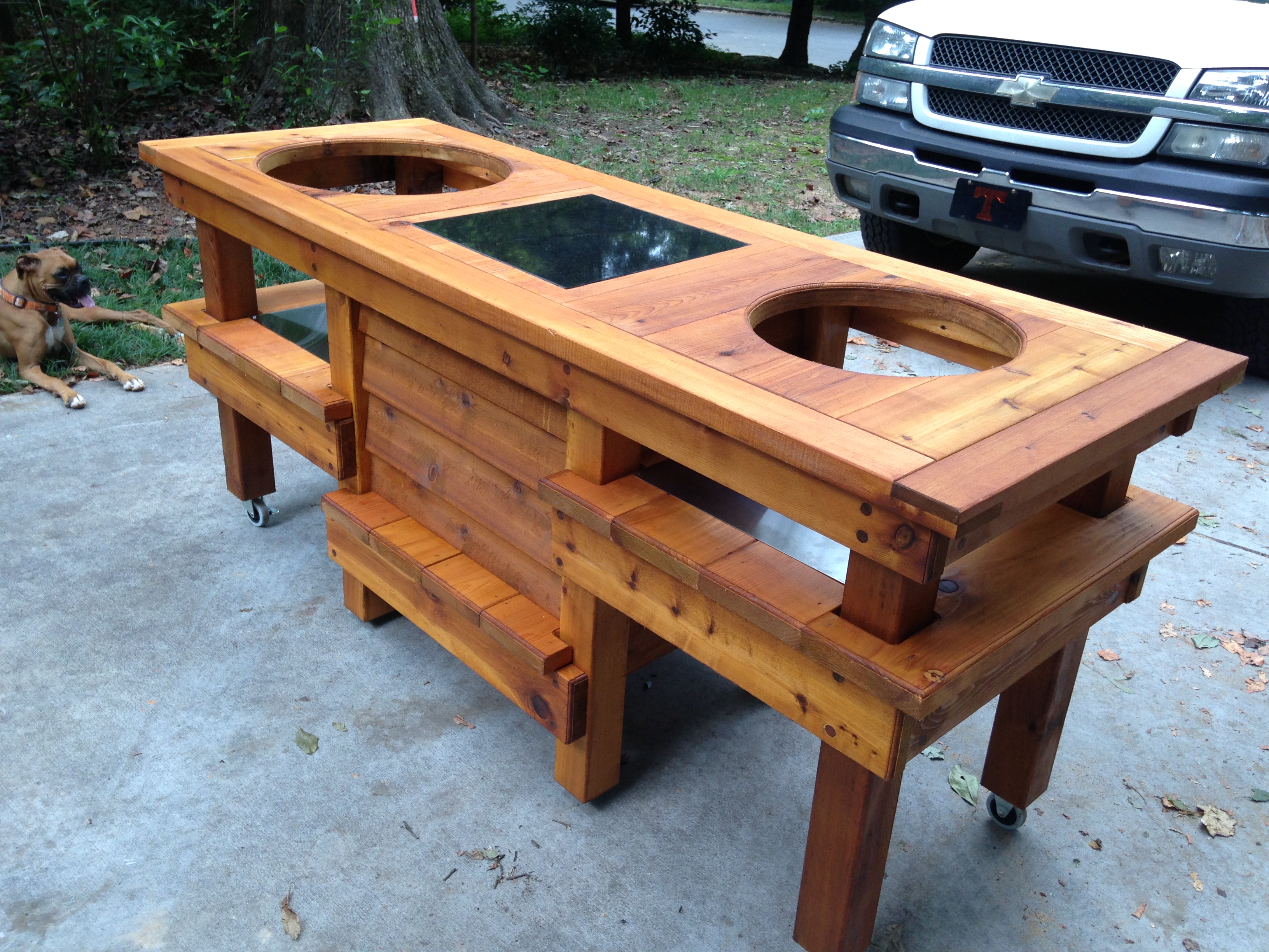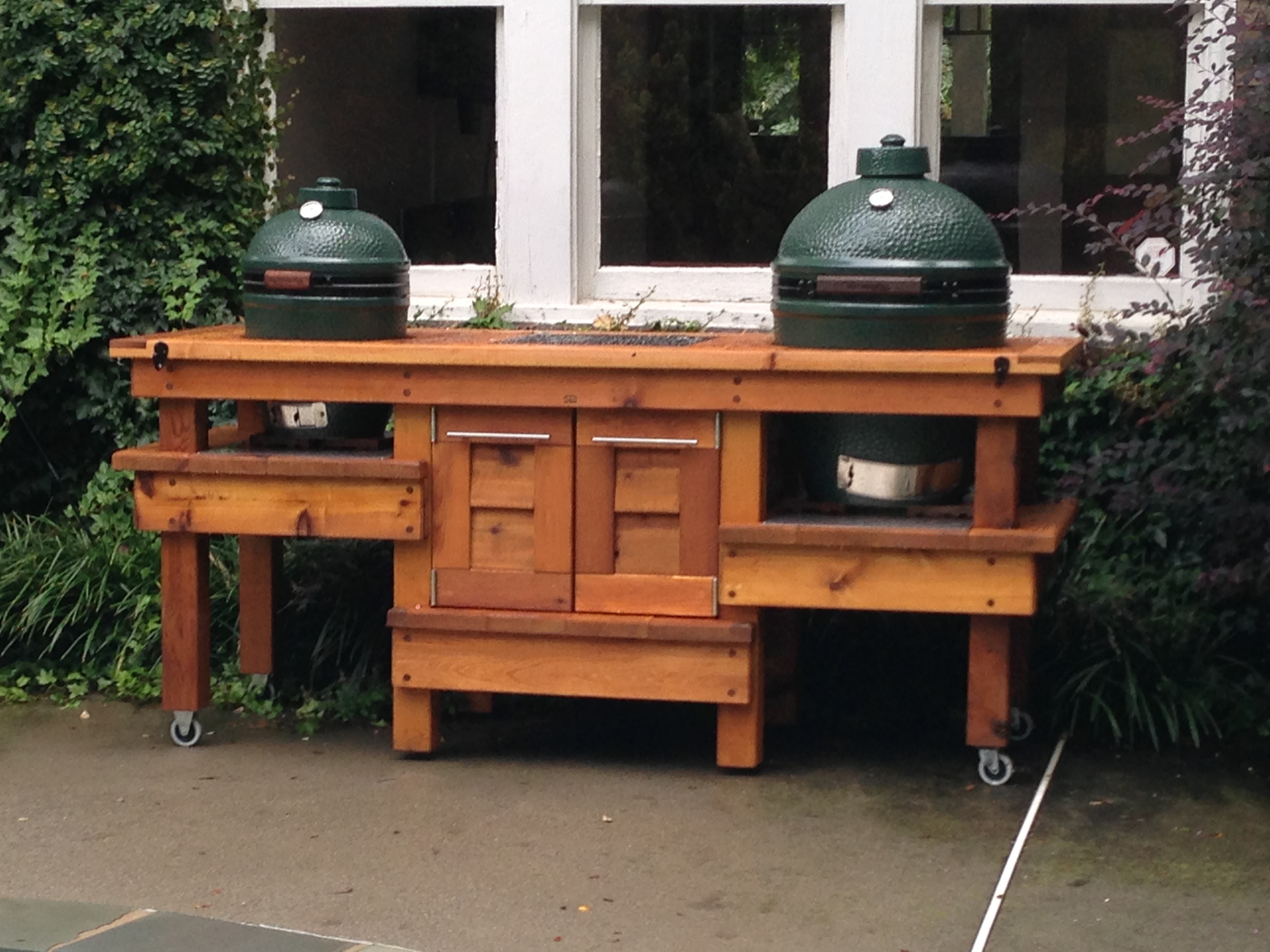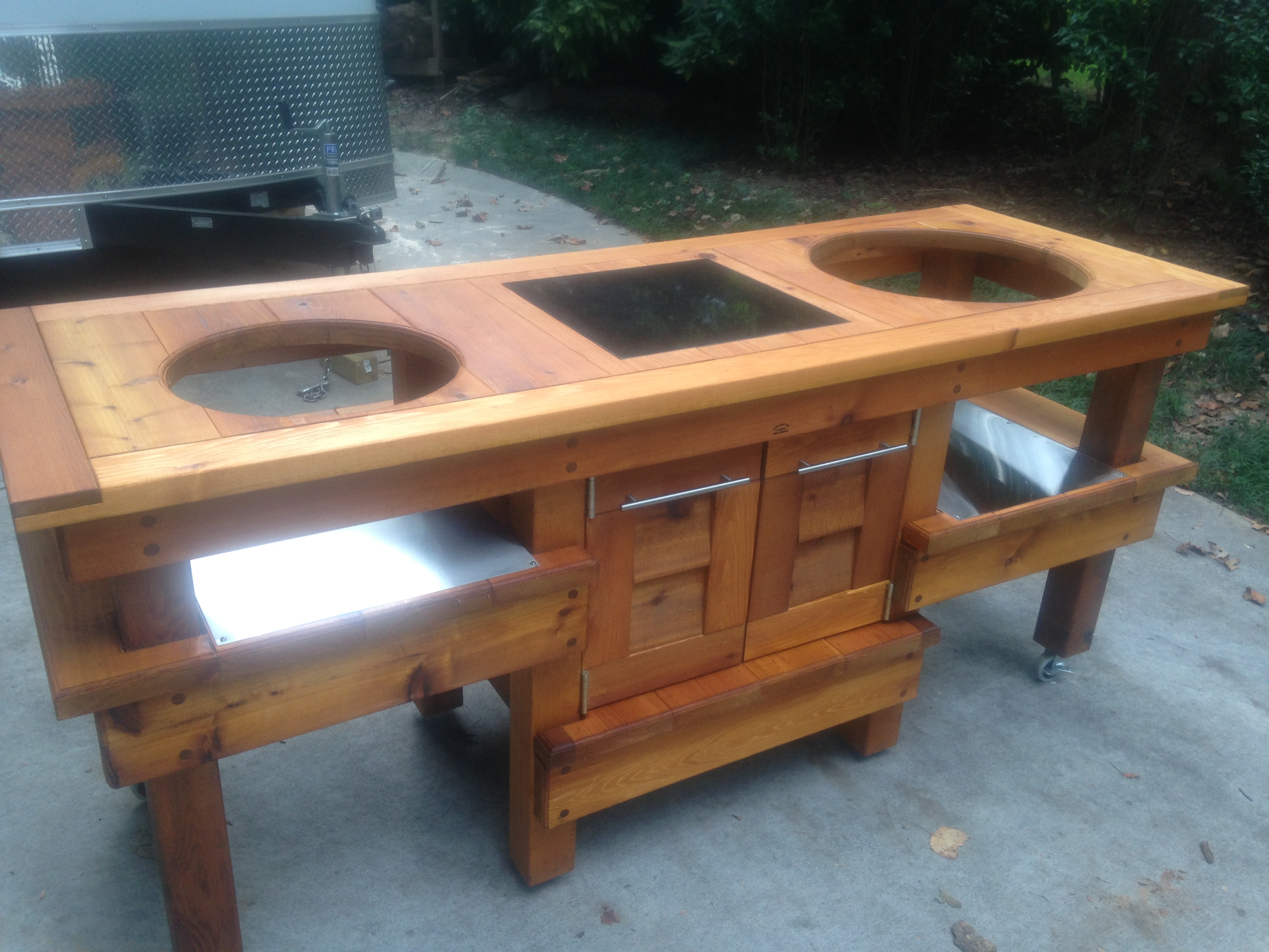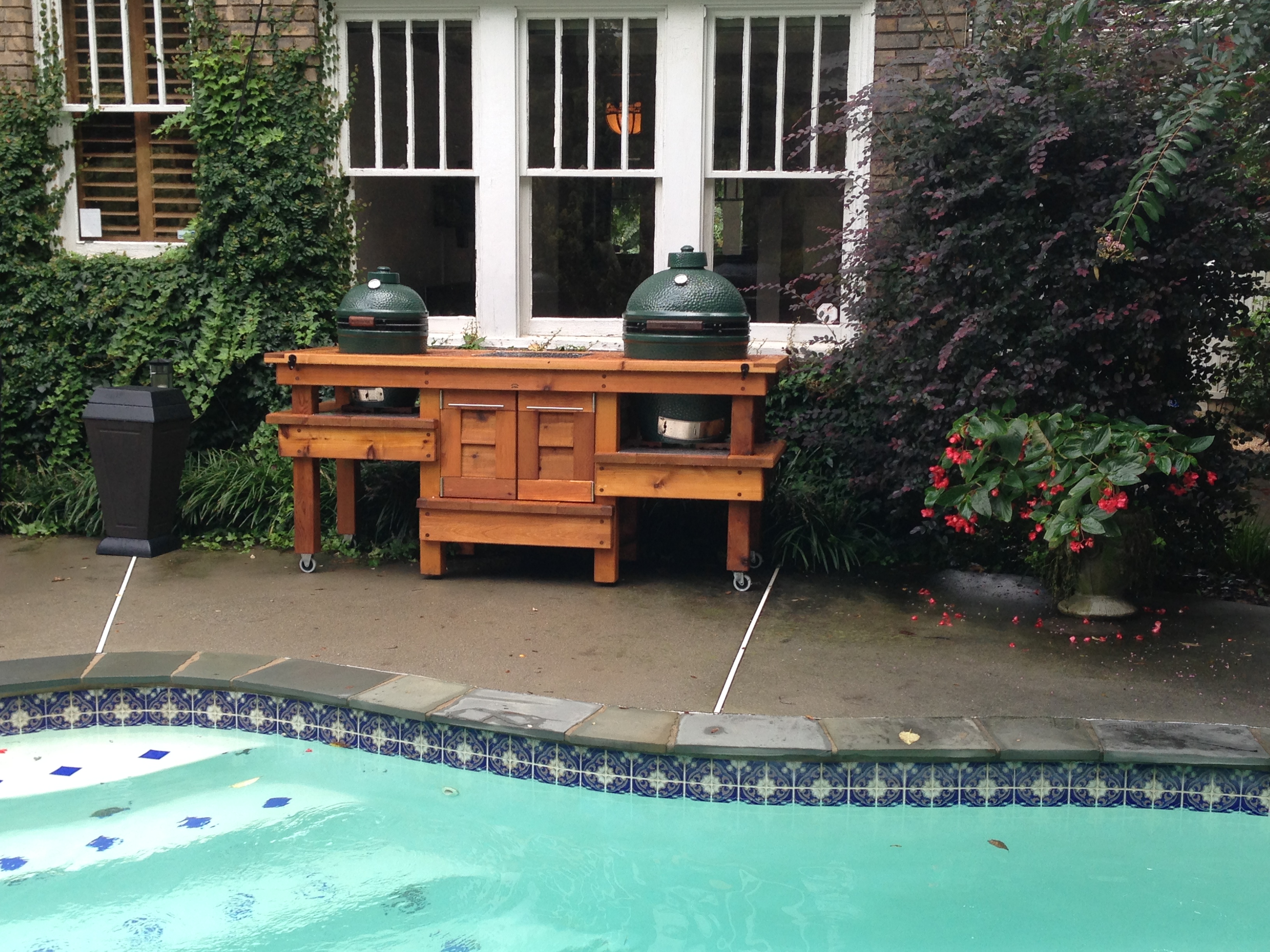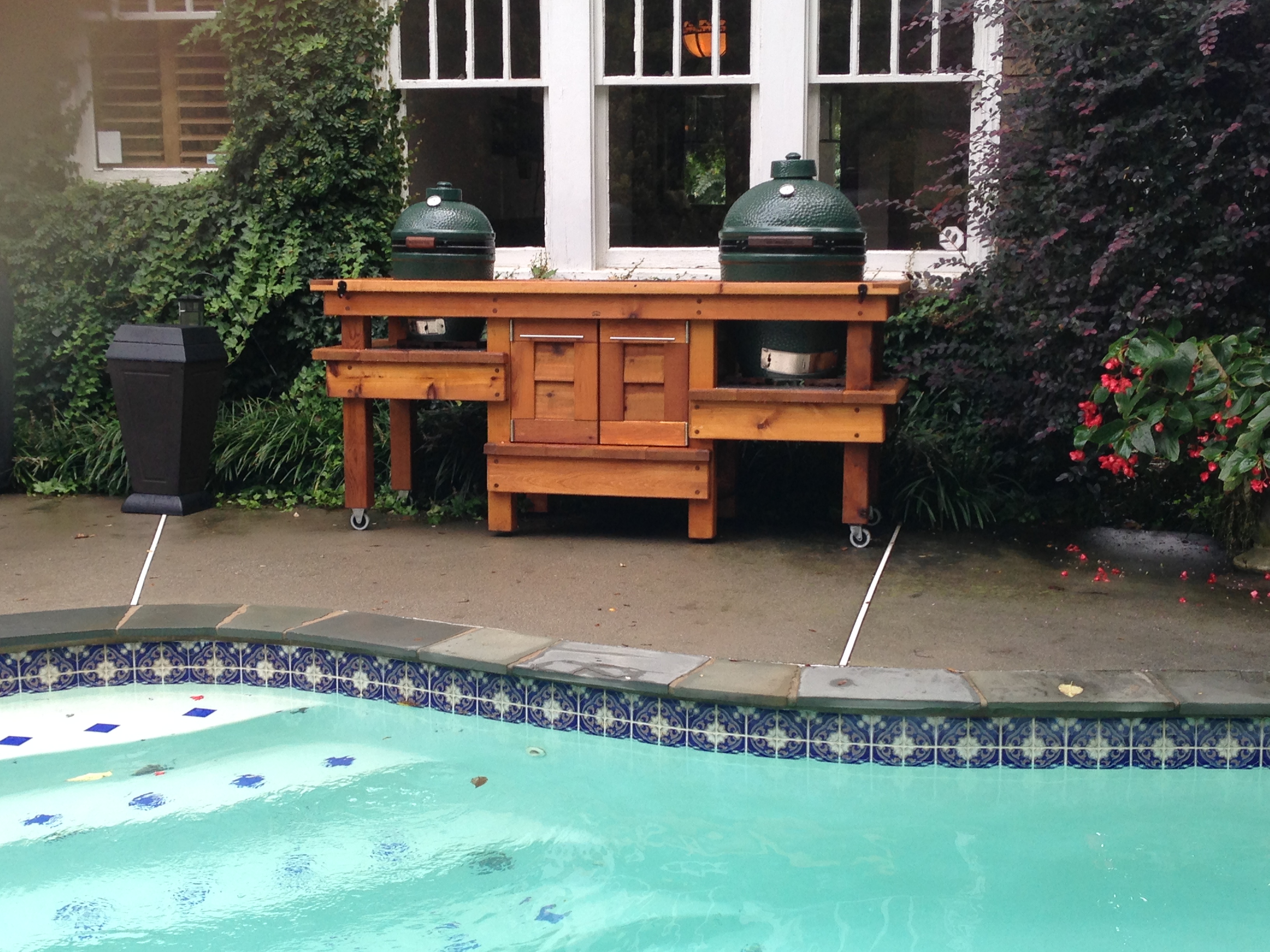 This table was recently completed for a client in Midtown Atlanta. It measures 7′ x 30″. It is made entirely from cedar. The table was custom designed, with the clients specific needs in mind and is made to house TWO Big Green Eggs. A large on the right, and a small on the left.