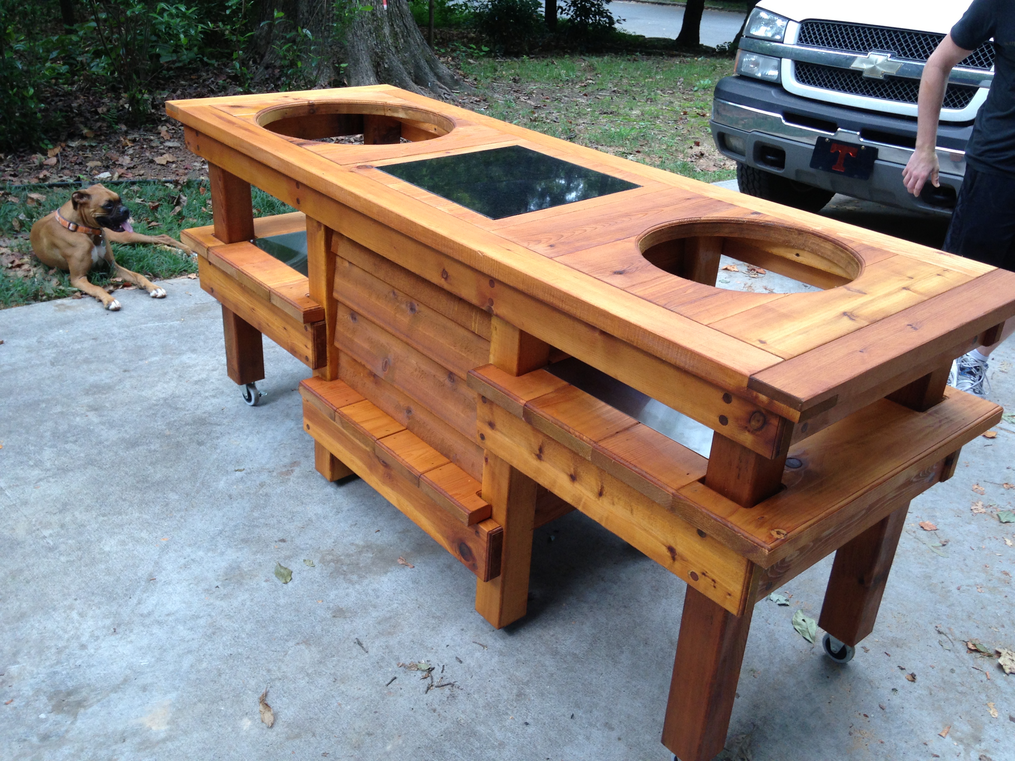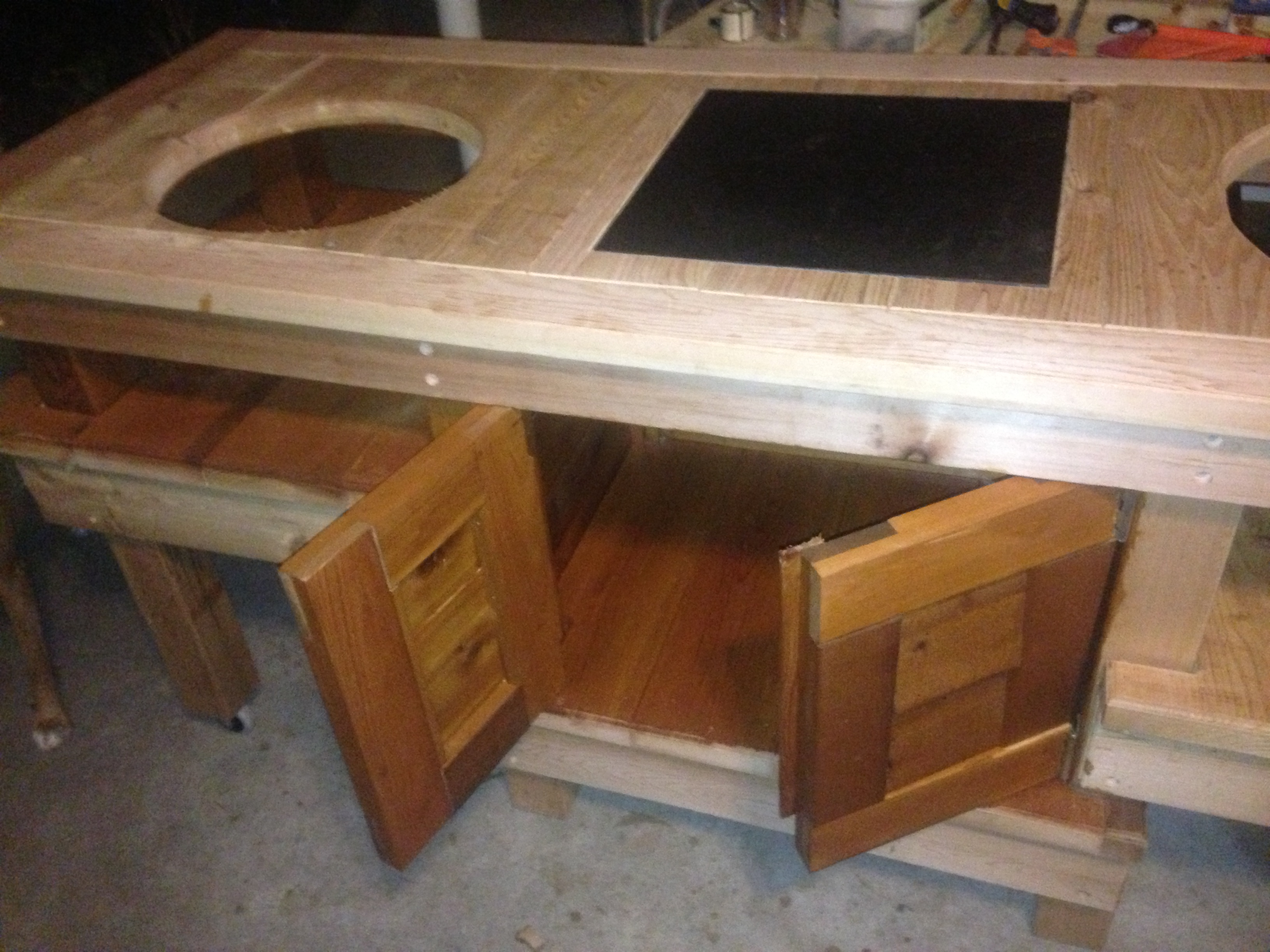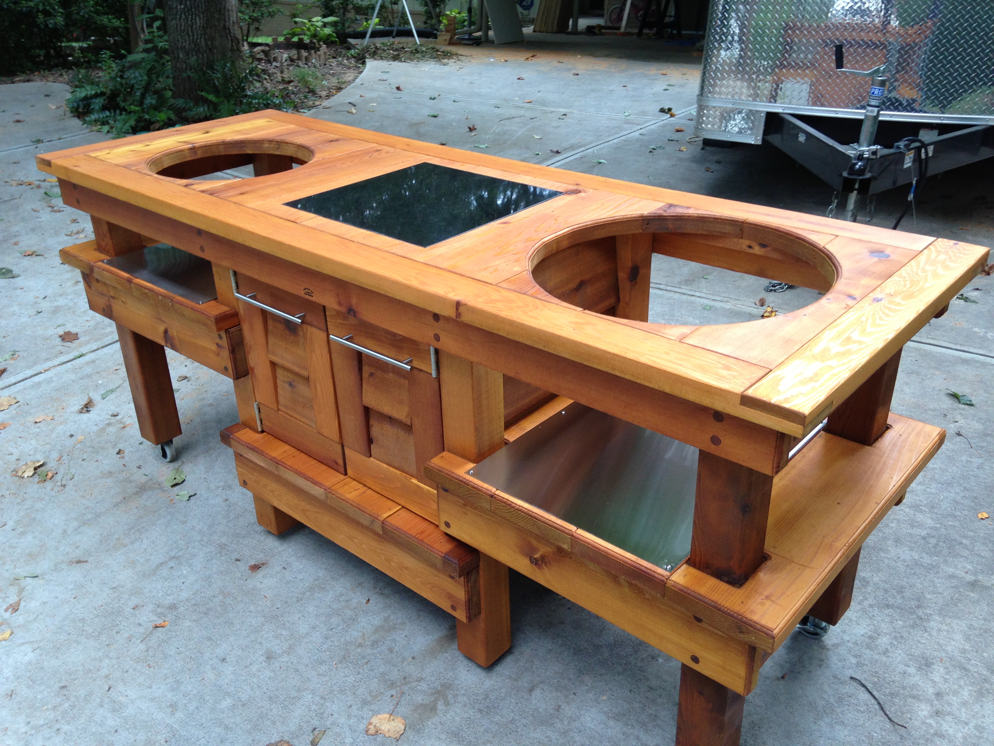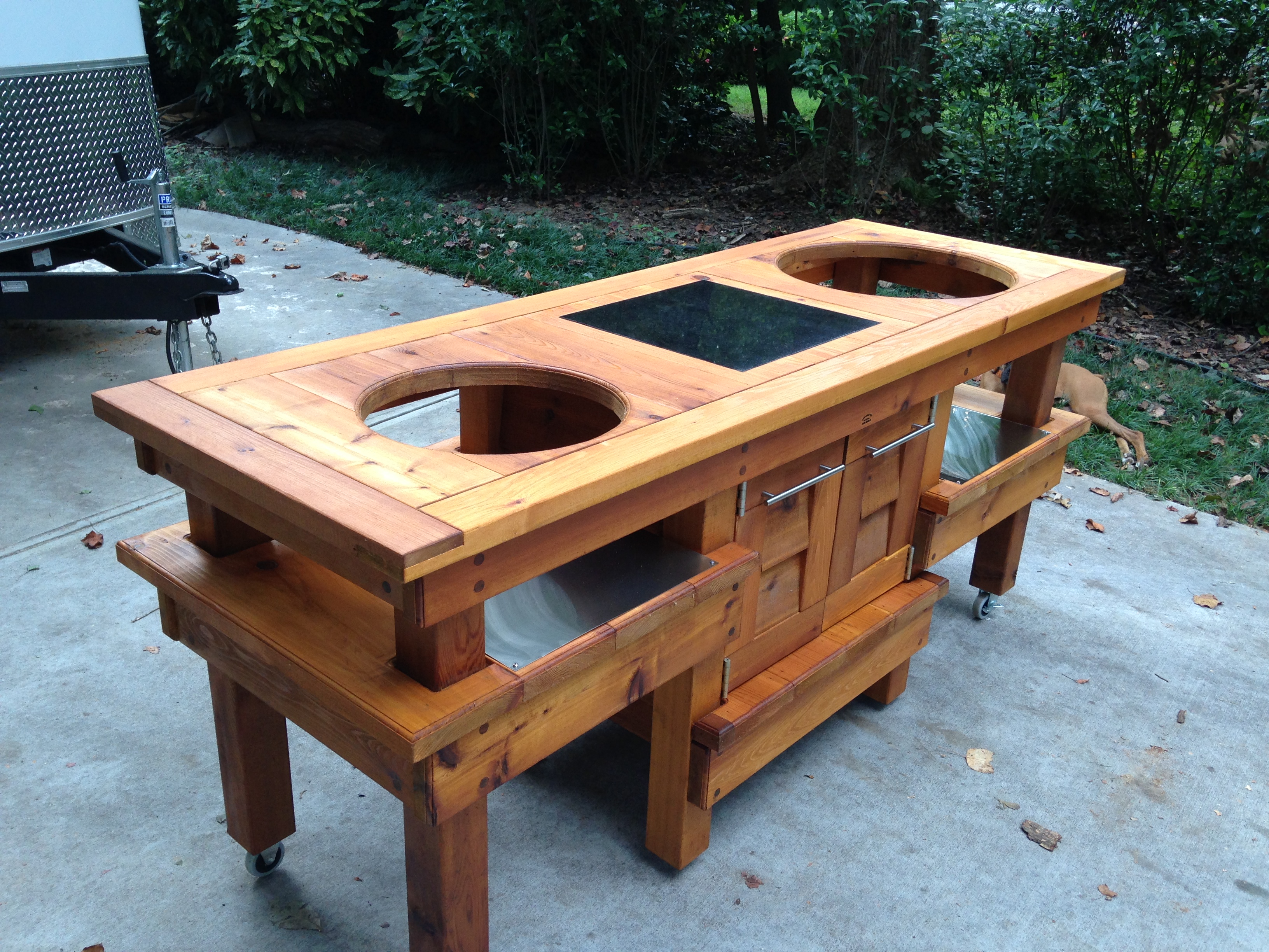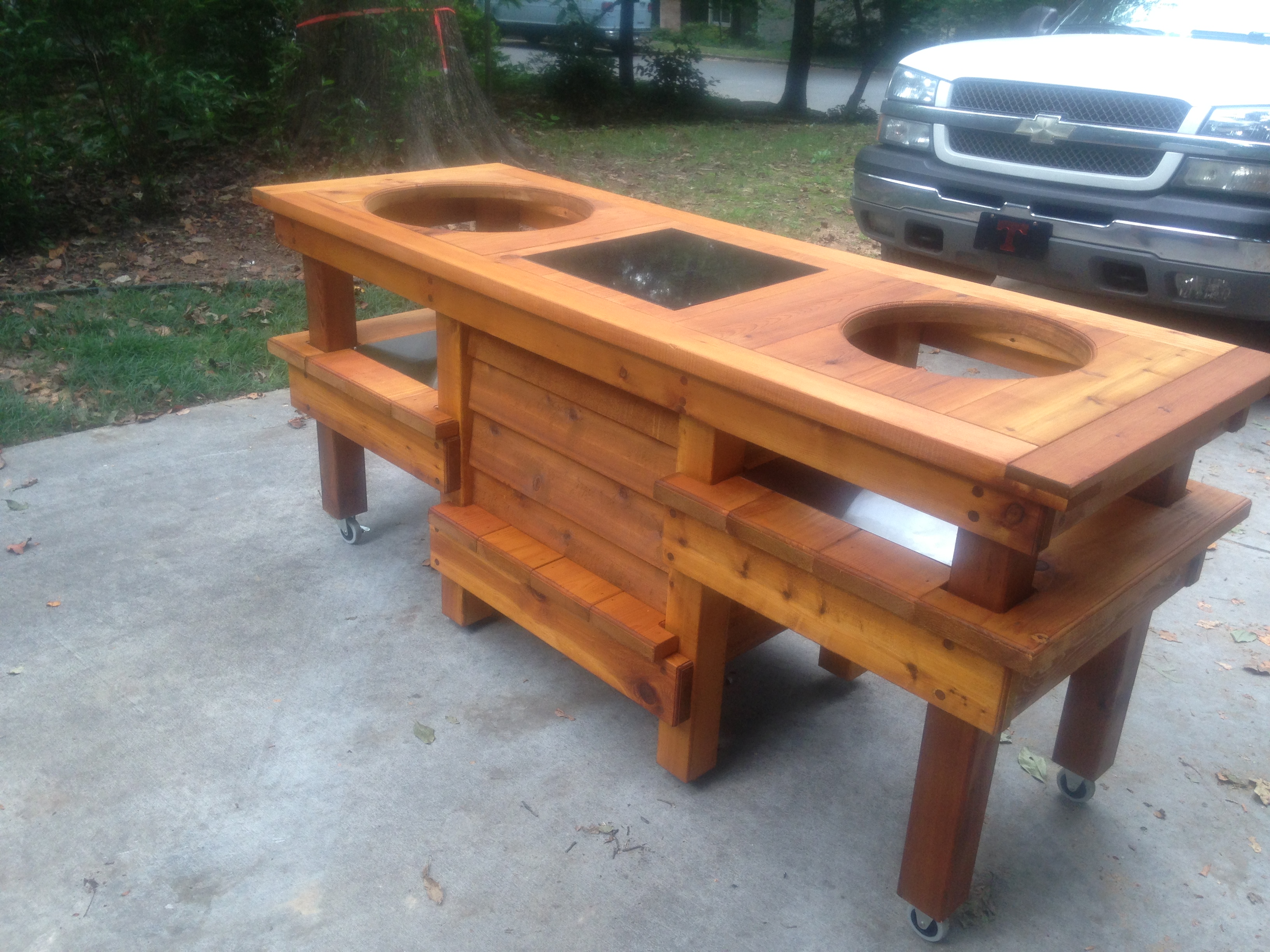 This table was recently completed for a client in Midtown Atlanta. It measures 7′ x 30″. It is made entirely from cedar. The table was custom designed, with the clients specific needs in mind and is made to house TWO Big Green Eggs. A large on the right, and a small on the left.