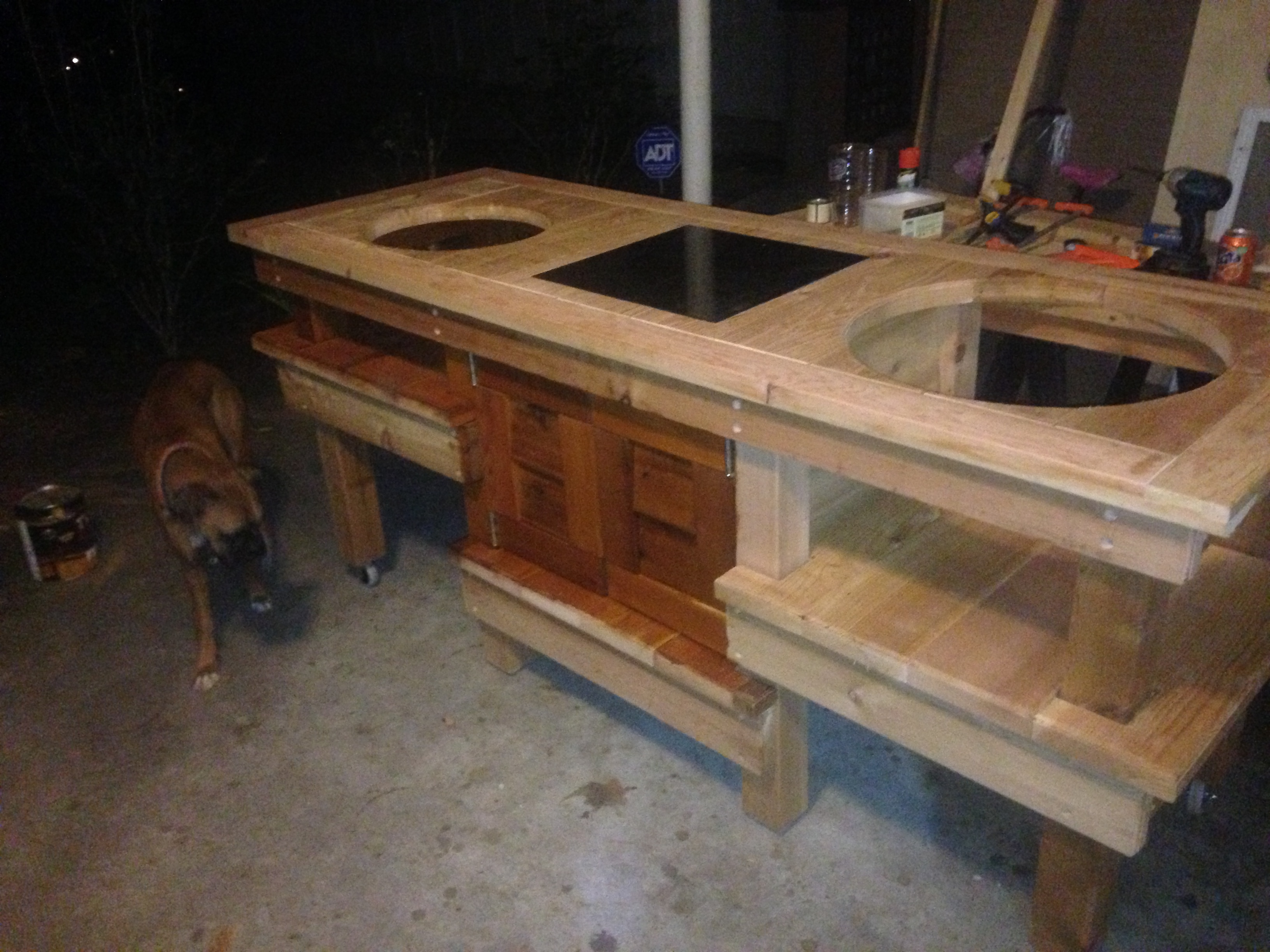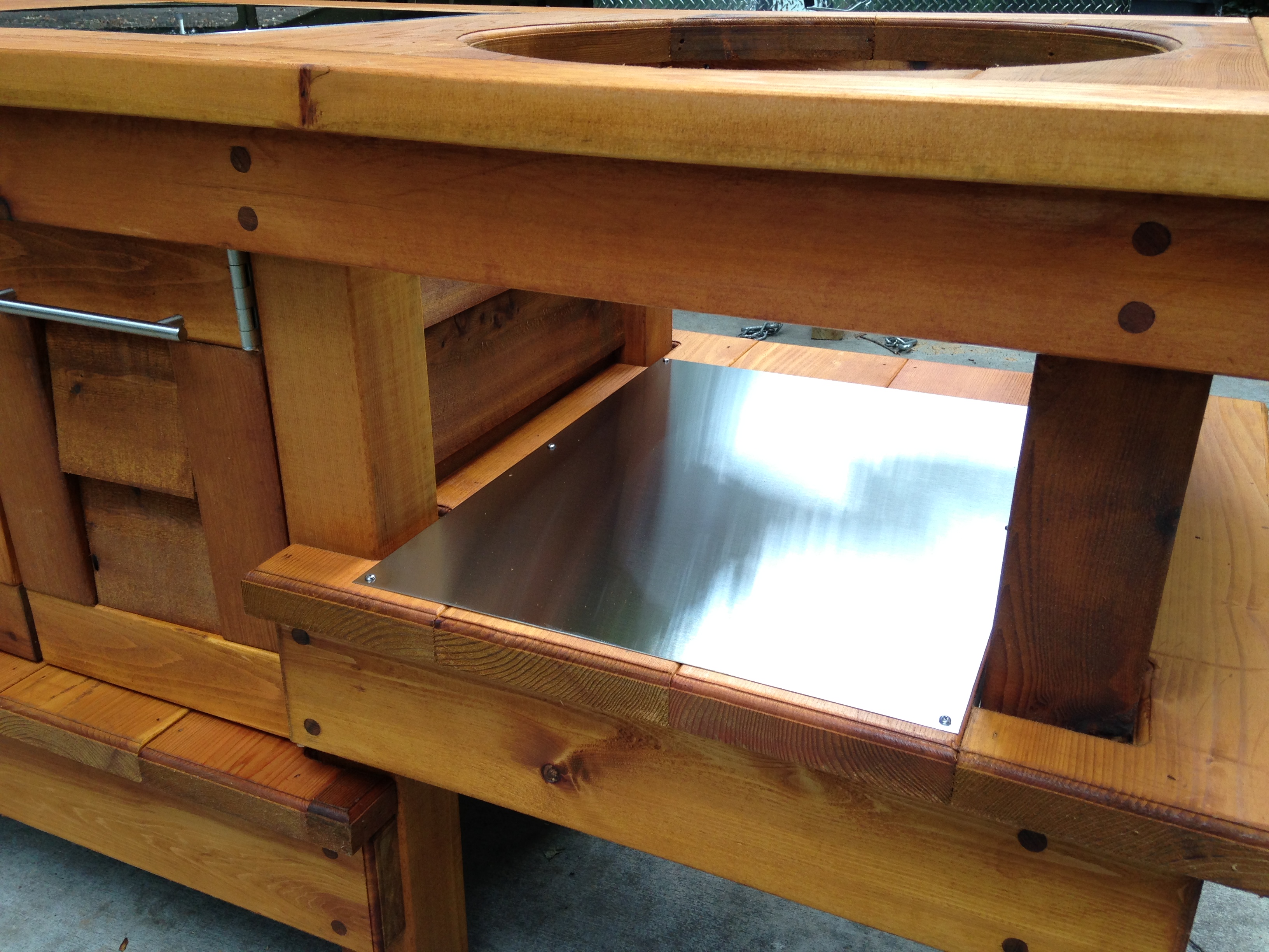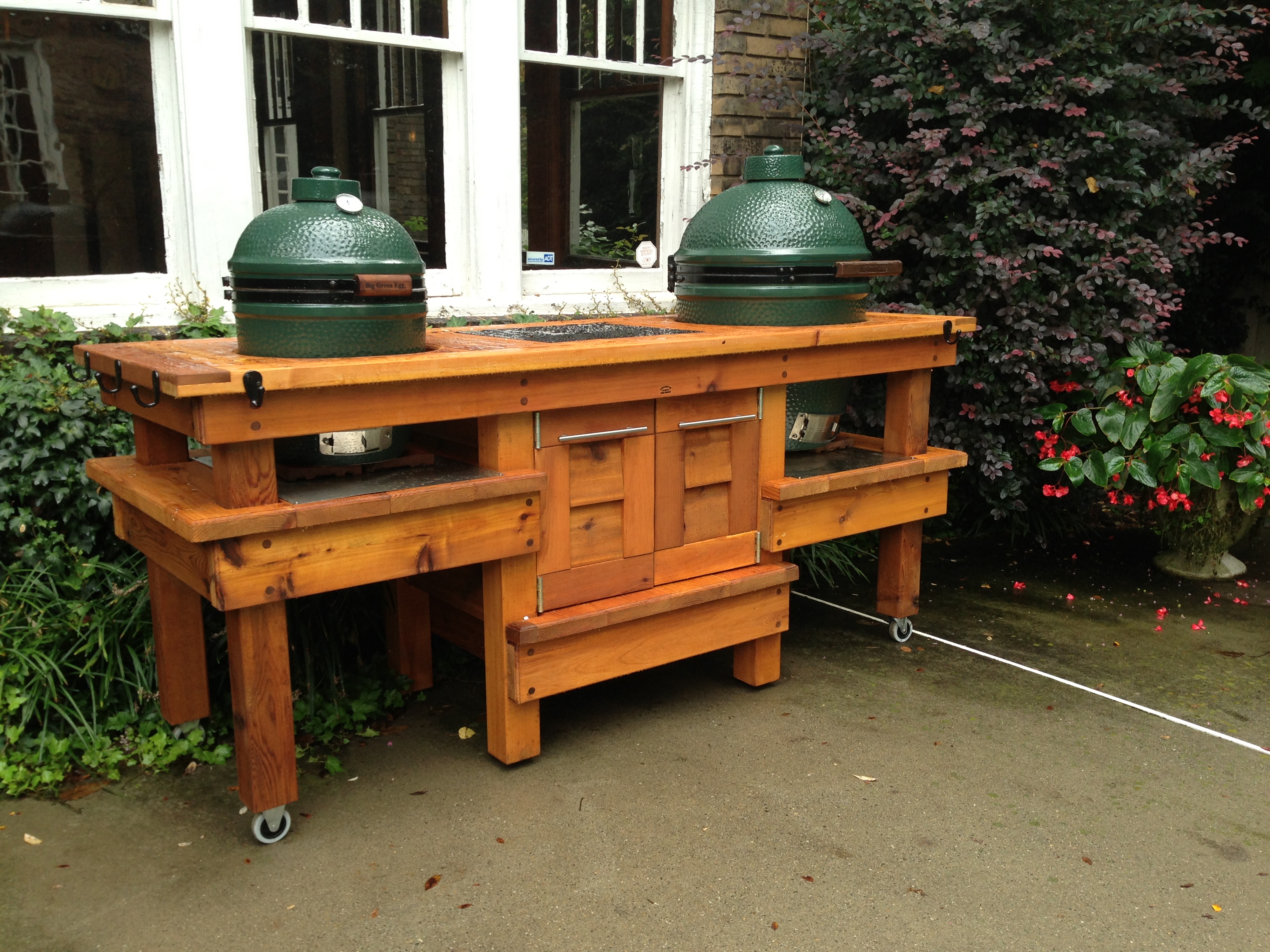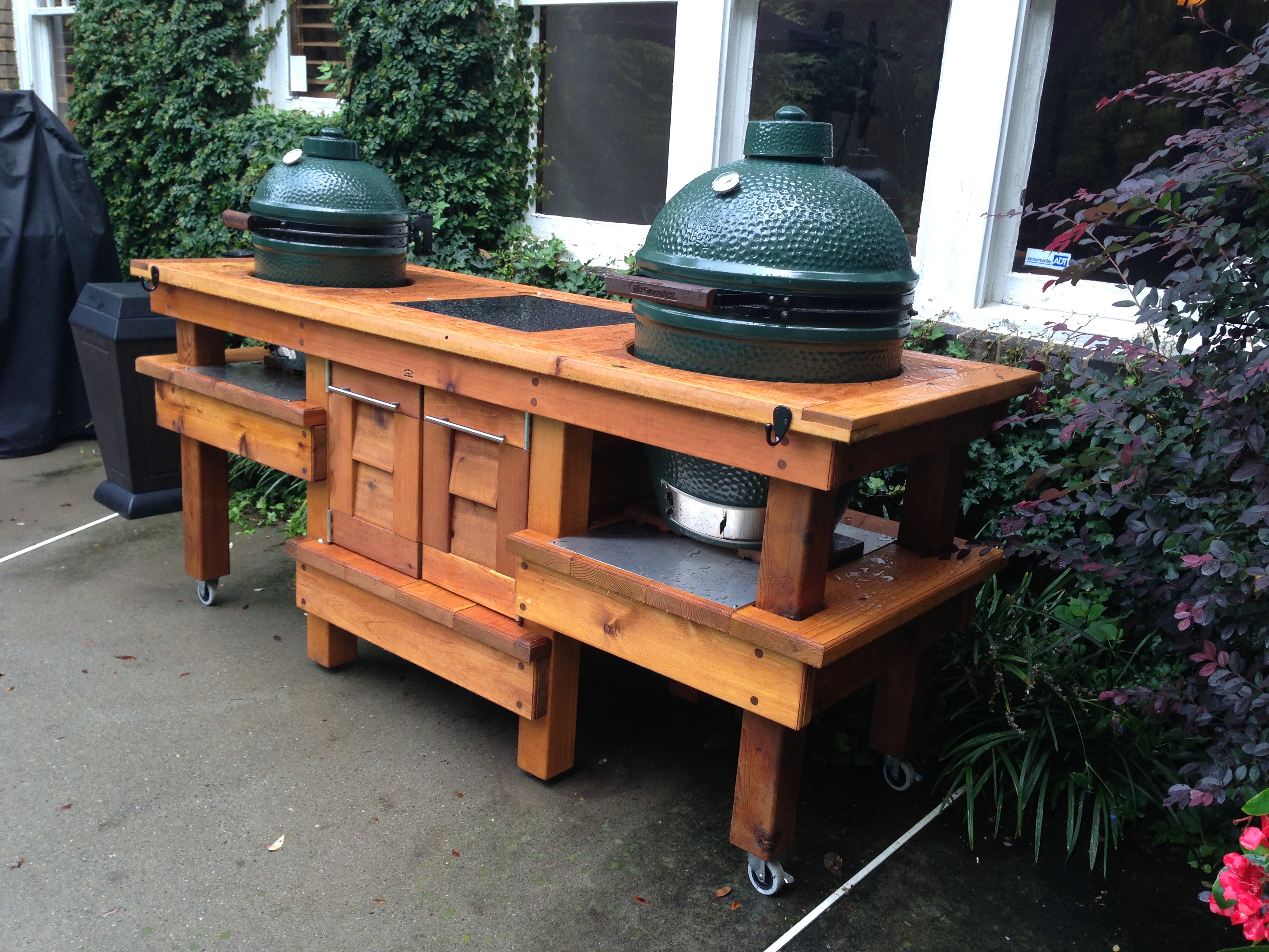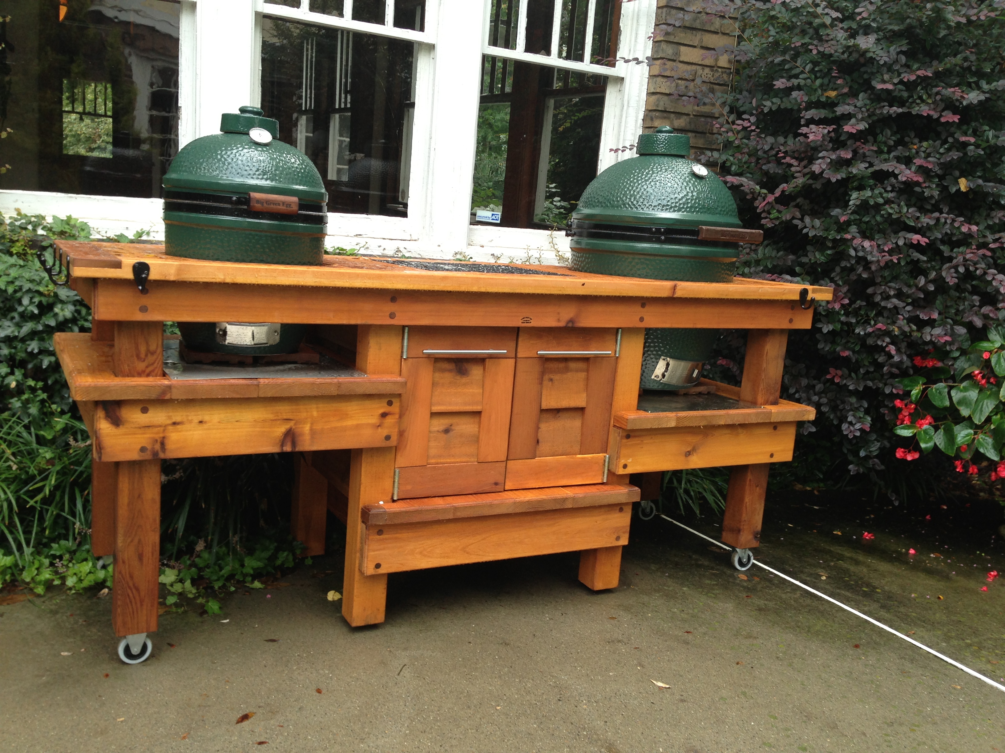 This table was recently completed for a client in Midtown Atlanta. It measures 7′ x 30″. It is made entirely from cedar. The table was custom designed, with the clients specific needs in mind and is made to house TWO Big Green Eggs. A large on the right, and a small on the left.